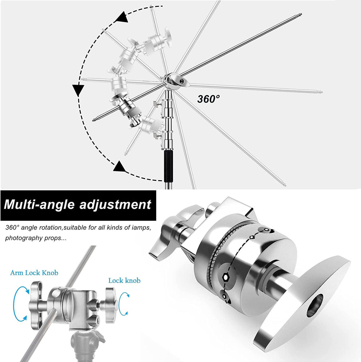 Product Parameters:Material: Stainless Steeltelescopic Height Of Light Stand: 150~ 330Cmlight Stand Weight: 8.1Kglamp Holder Tube Diameter: F2.5/3/3.5Cmbar Length: 128Cmdiameter Of Cross Bar: F1.6Cmcrossbar Weight: 0.6Kgheavy-Duty And Durable:The Magic Legs Are Made Of Bold Stainless Steel, And The All-Metal Structure Can Bear 20Kg. It Is Suitable For All Kinds Of Lamps And Photography Props.Stainless Steel C-Shaped Tripod:It Adopts A Detachable Type, The Three-Pronged Leg Occupies A Small Area And Has High Bearing Capacity, Which Is Suitable For Various Scenarios.