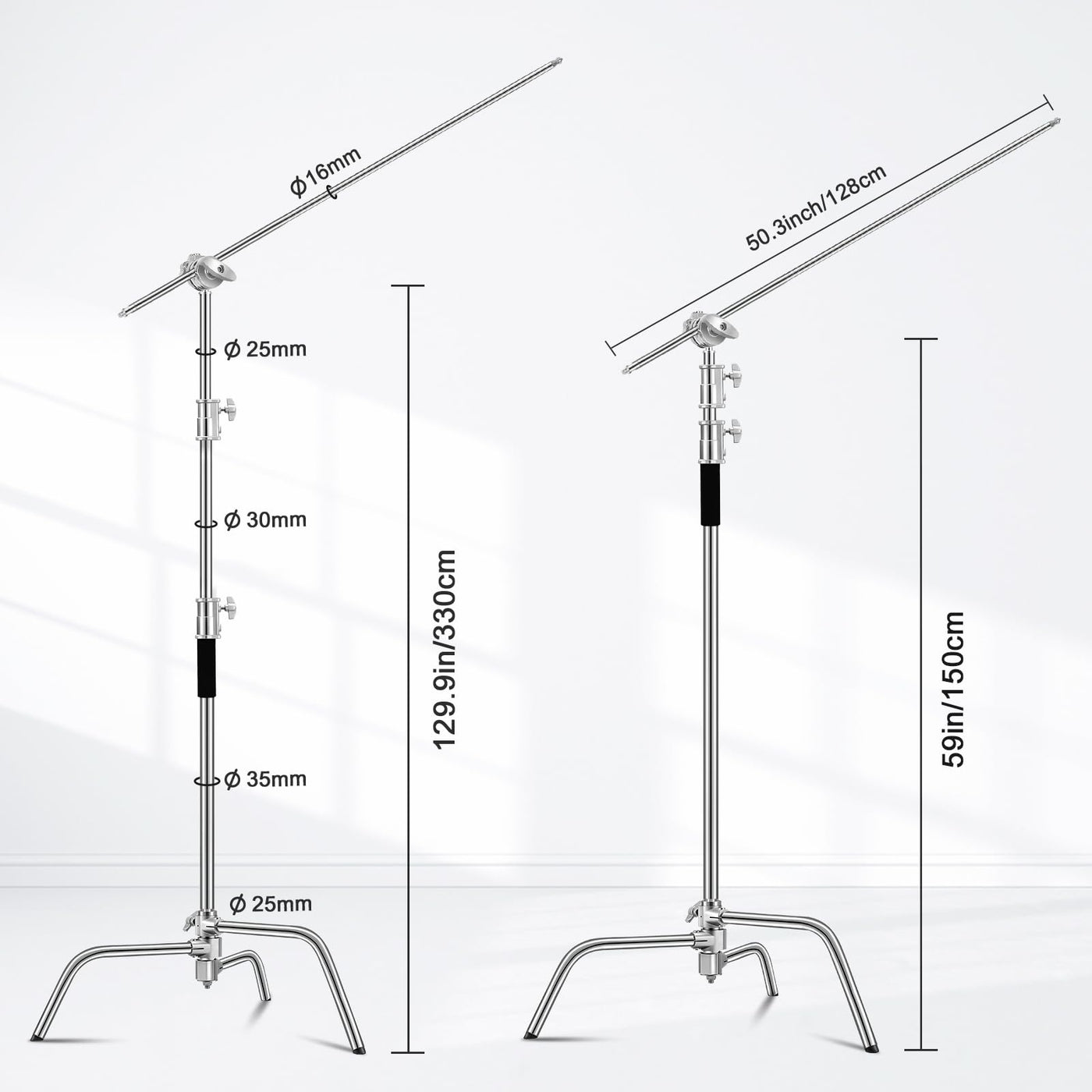 Q: What is the maximum height of the Heavy Duty C Stand?A: The Heavy Duty C Stand can be adjusted to a maximum height of 10.8ft (330cm), making it suitable for various photography setups.