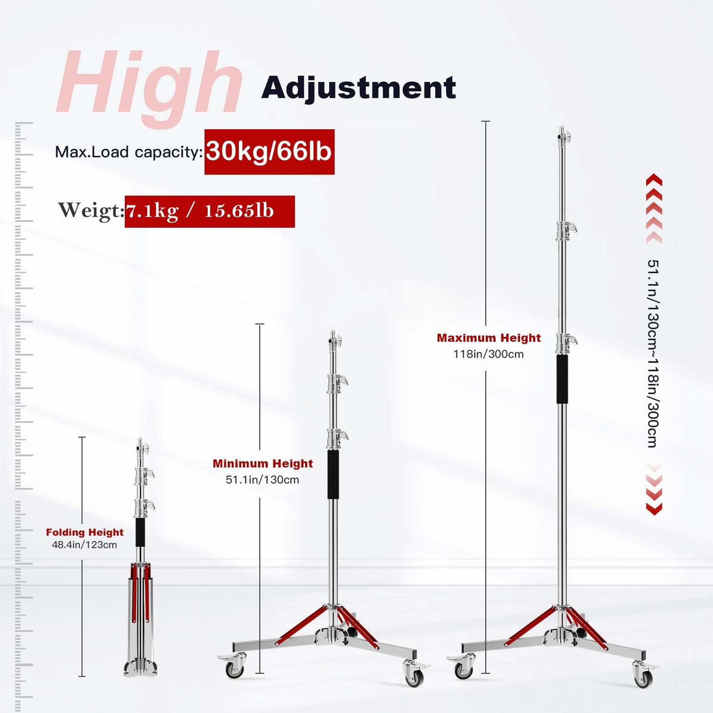 Heavy Duty Light Stand With Casters 100% Stainless Steel 30Kg/66Lb Load Bearing Adjustable 130/4.3Ft 305Cm/10Ft Photography Li