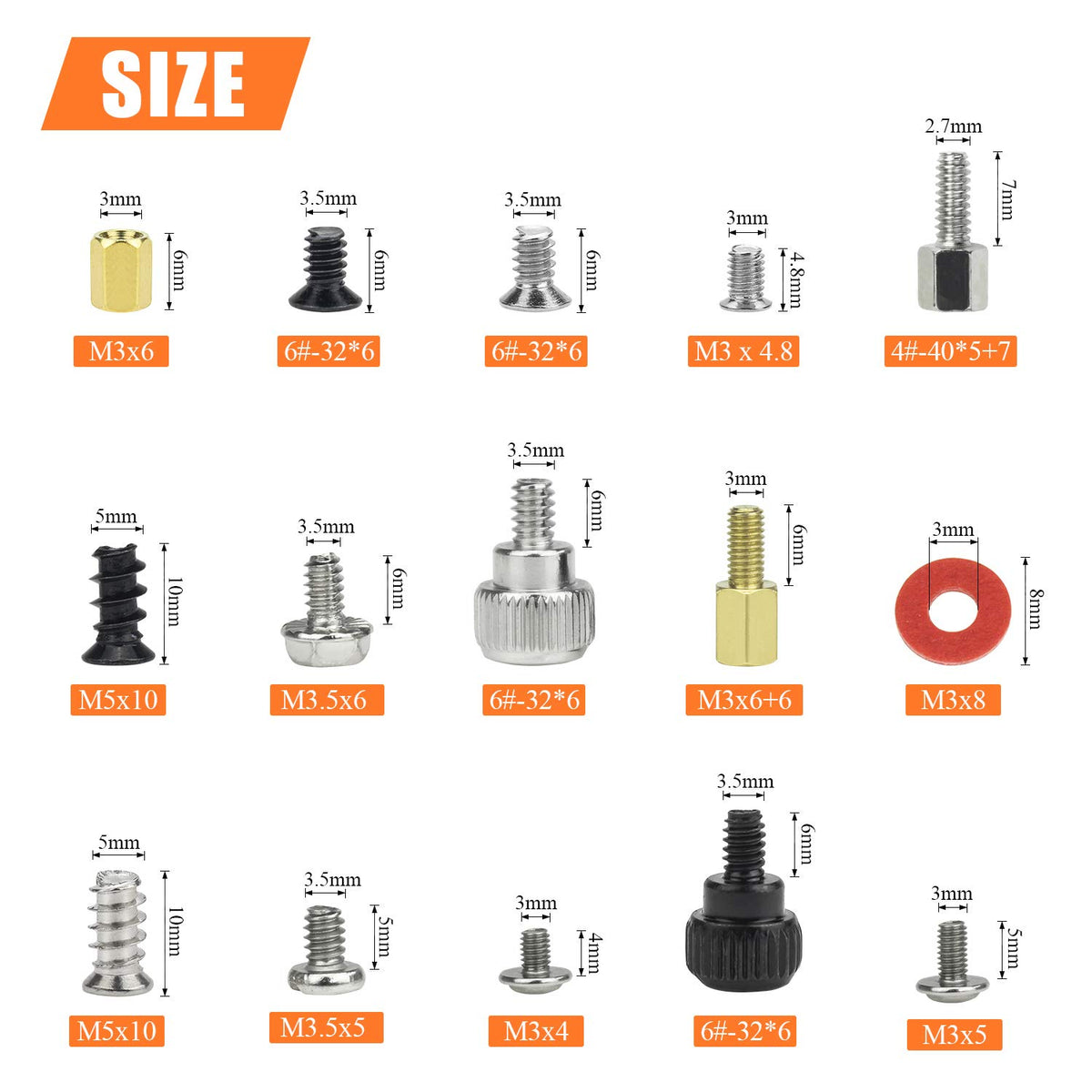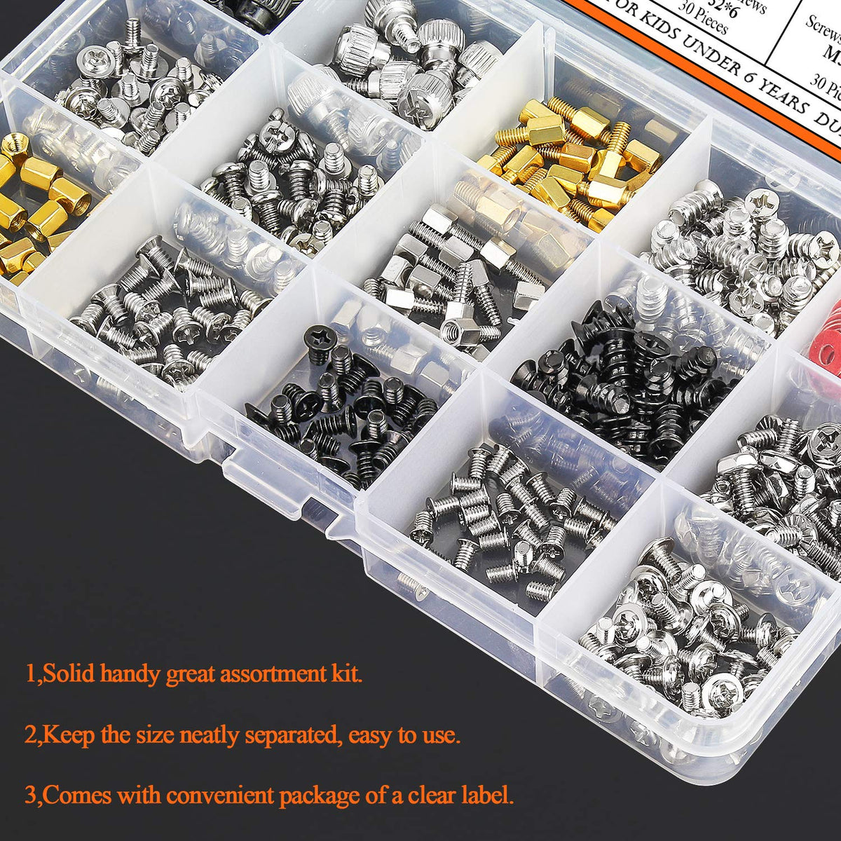 Specification: Package Quantity: 450 Pieces Material: Brass, Nickel Plated Steel, Black Zinc Plated Steel, Fiber Paper Type: Thumb Screw, Fan Screw, Cd-Rom Screw, Hard Drive Screw, Mainboard Screw, Brass Standoffs, Brass Spacer, Main Board Insulation Gasket Feature: Made Of High Quality Brass, Steel And Fiber Paper, Steel With Nickel And Black Zinc Plated, Which Have Superior Rust Resistance And Excellent Oxidation Resistance. Whether You Are A Pc Building Hobbyist Or A Professional Tech, This Set Of Replacement Screw Accessories Is A Necessity And The Quantity Should Last For Several Projects Package Included: Thumb Screws 6#-32*6---------------------------10 Pieces Thumb Screws 6#-32*6---------------------------10 Pieces Brass Standoffs Screws M3 X 6 + 6--------------20 Pieces Chassis Fans Retaining Screws M5 X 10----------30 Pieces Main Board Washers M3 X 8---------------------100 Pieces Cd-Rom Set Screws M3 X 4-----------------------30 Pieces Hard Drive Screws 6#-32*5----------------------30 Pieces Steel Standoffs Screws 4#-40*5+7---------------20 Pieces Chassis Fans Retaining Screws M5 X 10----------30 Pieces Chassis High-Strength Screws 6#-32*6----------30 Pieces M3 X 6Mm Brass Standoffs----------------------20 Pieces Flat Head Hard Drive Screws 6#-32*6-----------30 Pieces Flat Head Hard Drive Screws 6#-32*6-----------30 Pieces M3 X 4.8Mm Screws For 2.5'' Ssd----------------30 Pieces Main Board Fixed Screws M3 X 5----------------30 Pieces Package Quantity: 450 Pieces Warning: Small Parts, Keep Away From Children And Kids.