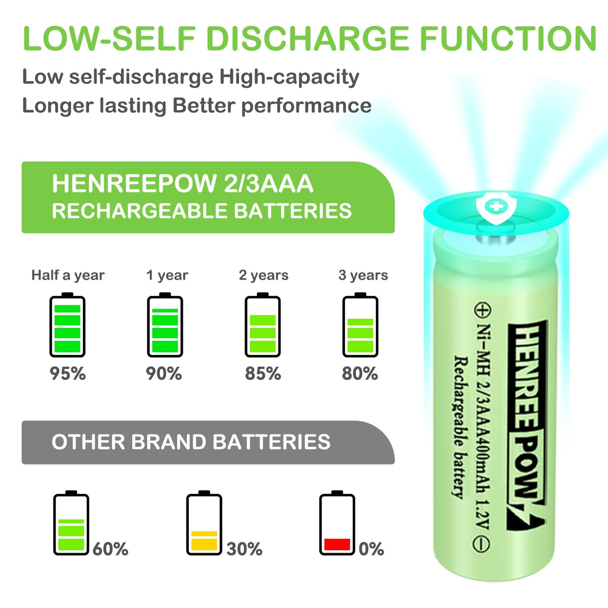 Q: What is the discharge rate of the Henreepow 2/3AAA Solar Battery?A: This battery has a low self-discharge rate, allowing it to hold charge effectively for longer periods.