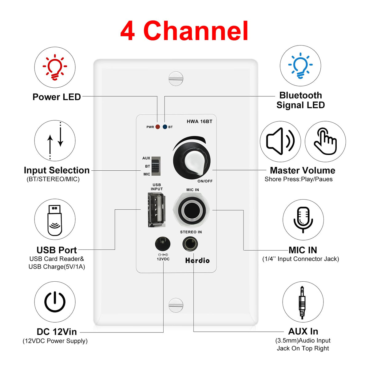 ?Dual Independent 4 Channels: 3.5Mm Stereo Aux Input, Allows Connection With External Audio Devices, Sound Systems And More. Ideal For Speakers, Stereo Systems, Home Theater. Support (4) Speakers Working Simultaneously. | ?Microphone Paging & Usb Port: This Wall Plate Receiver Adds Convenient Microphone Paging Ability Along With Simple Source Audio Control.And A Usb Port For Device Charging. | ?Compatible With Bluetooth: Built In Technology Allows You To Stream Music To A Connected Speaker System. Compatible With All Of Today'S Latest Smart Devices. | ?Speakers Dimension: The Max Power Of In Ceiling Speakers(4 Speakers) Up To 640 Watts. Frequency Response Is 50Hz-20Khz With 89Db At 8 Ohm. It Can Achieve Wide-Ranged Sound Performance,Even In A Spacious Office You Can Experience The Stereo Surround Sound Of The Speakers . | ?Easy To Install: Wall Amplifier System Can Be Installed On Any Wall In The Home Or Office For Versatile Easy To Access Sound Configuration For Easy Set Up. The Passive Ceiling Speaker Use Flush Mount Design, Easy In-Wall/In-Ceiling Installation That Bring You A Clean And Tidy Wall.