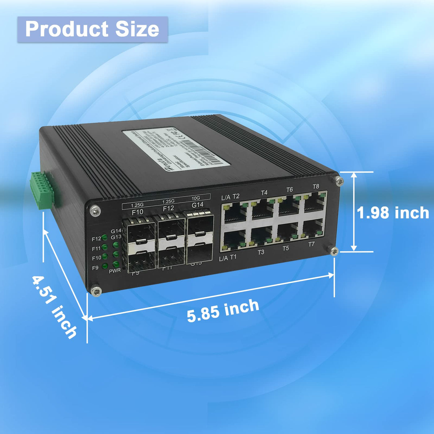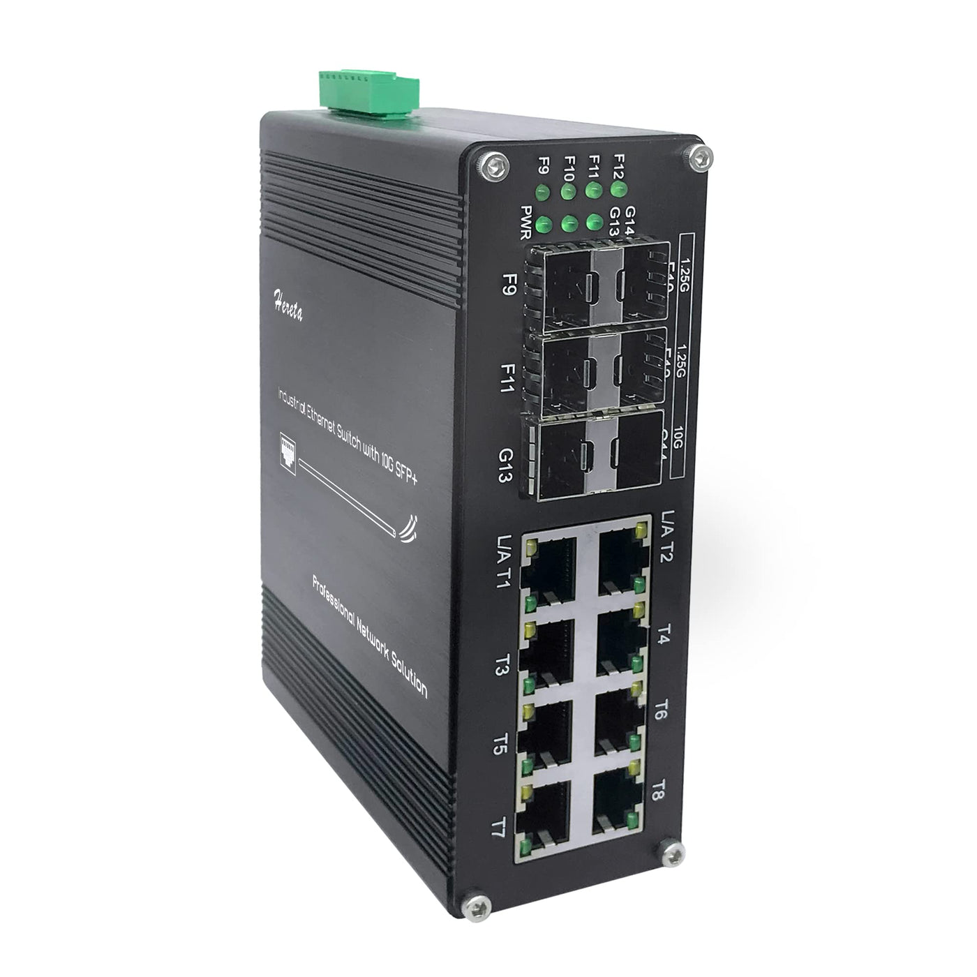 Q: What types of connections does the Hereta Industrial Gigabit Fiber Optical Ethernet Switch support?A: The Hereta Industrial Gigabit Fiber Optical Ethernet Switch supports various connections, including 8 ports for 10/100/1000BASE-T Ethernet, 4 ports for 1000Base-FX SFP, and 2 ports for 10G Base-SR/LR SFP+. This allows for flexible network integration with both copper and fiber connections.