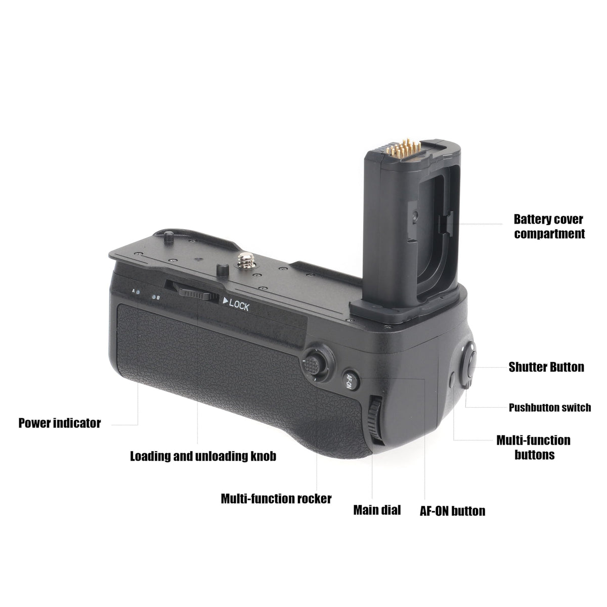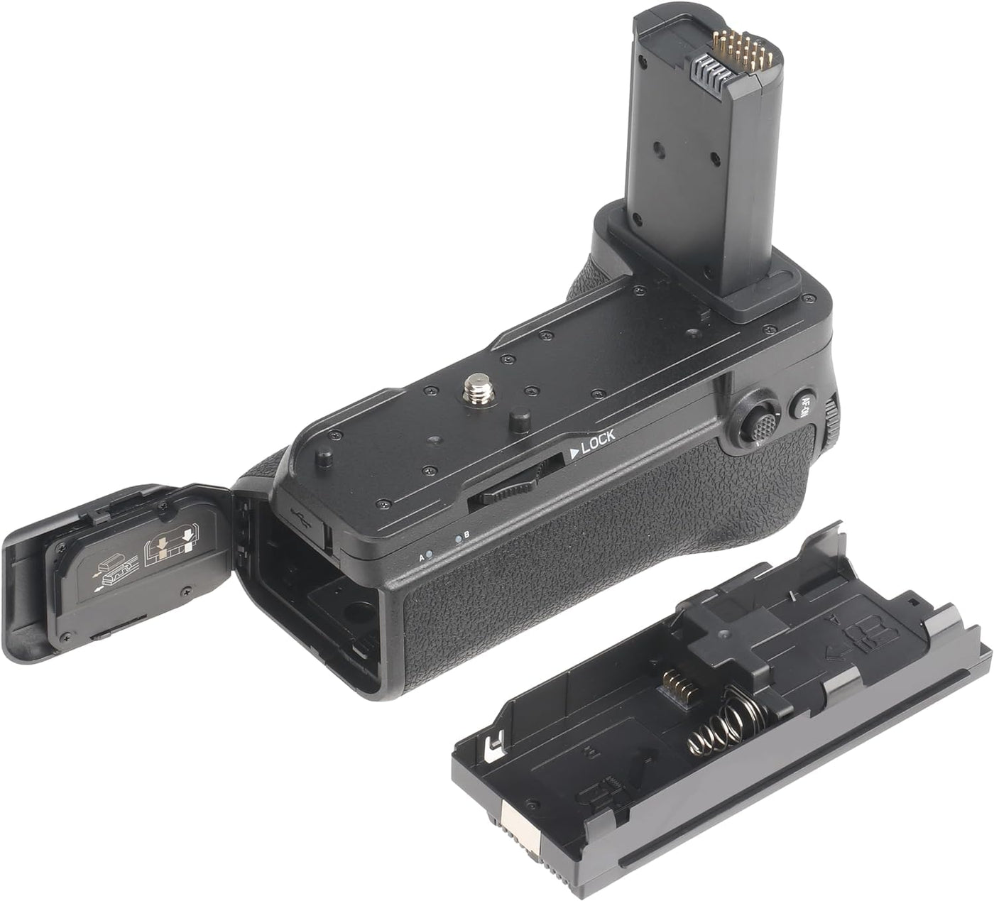 Q: How does the battery compartment system work in this grip?A: The grip features two separate battery compartments, labeled A and B. The camera will consume power from compartment A first, then switch to compartment B once A is depleted. This allows you to replace the run-out battery without turning off the camera.