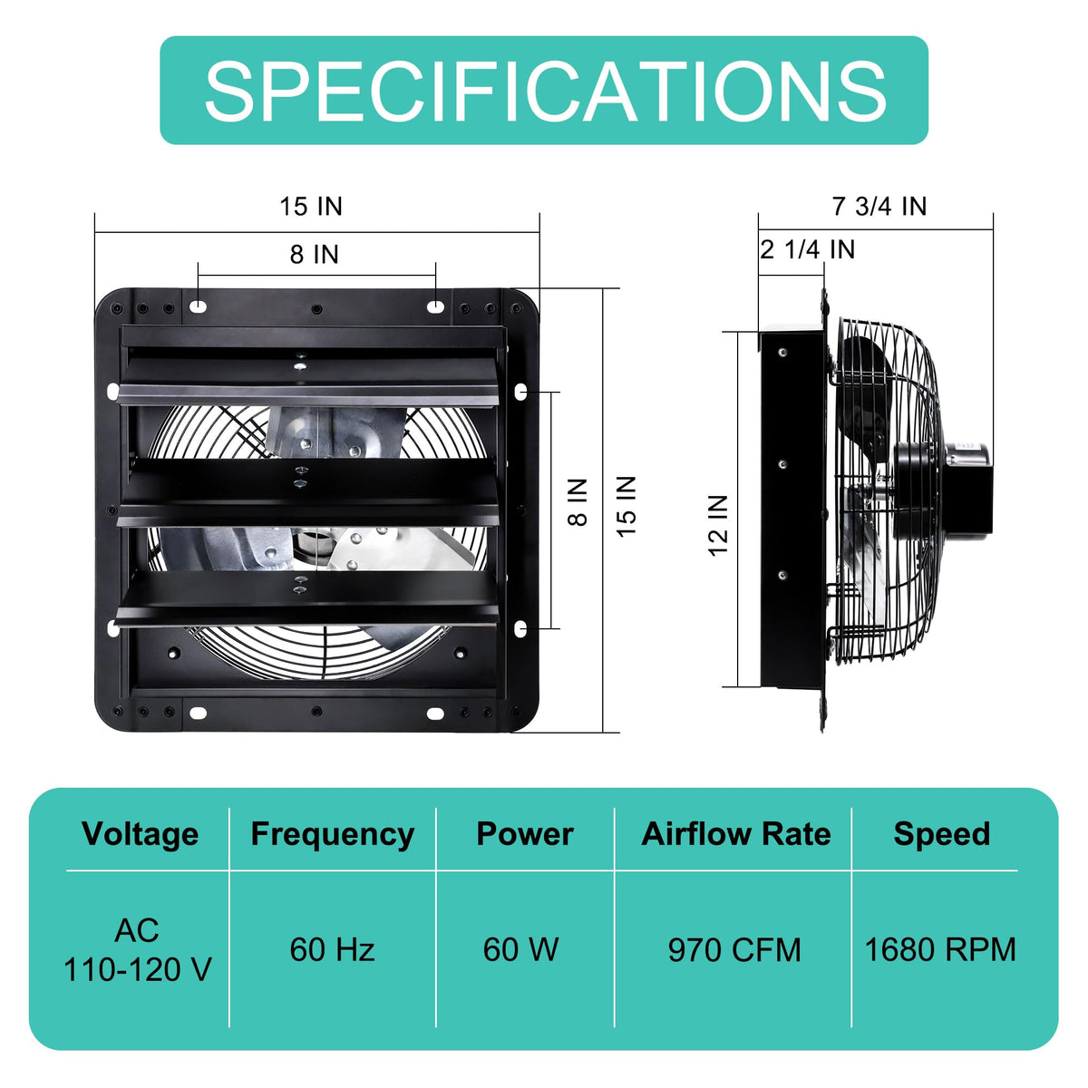 12 Inch Shutter Exhaust Fan Can Be Widely Used As Attic Fan, Greenhouse Fan, Shop Fan, Garage Fan, Kitchen Fan, Bathroom Fan, Chicken Coop Fan For Ventilation.Specification:Voltage: Ac 110-120 V Frequency: 60 Hz Power: 60 Wairflow Rate: 970 Cfmspeed: 1680 Rpm