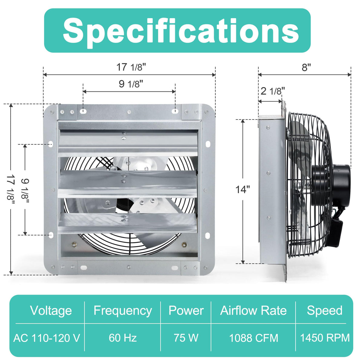 14 Inch Shutter Exhaust Fan Can Be Widely Used As Attic Fan, Greenhouse Fan, Shop Fan, Garage Fan, Kitchen Fan, Bathroom Fan, Chicken Coop Fan For Ventilation.Specification:Voltage: Ac 110-120 V Frequency: 60 Hz Power: 75 Wairflow Rate: 1088 Cfmspeed: 1450 Rpm