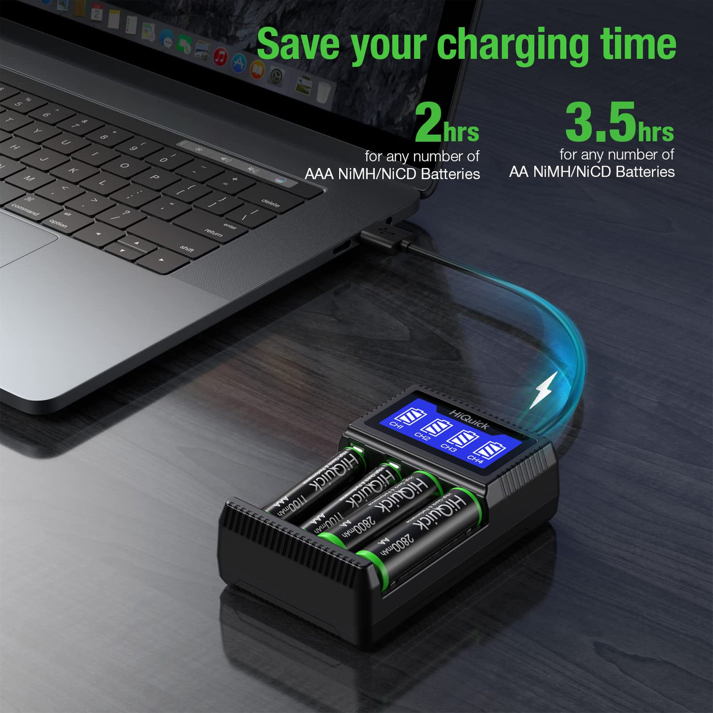 Q: How long does it take to charge AA and AAA batteries using this charger?A: The HiQuick charger can charge AAA batteries in approximately 2 hours and AA batteries in about 3.5 hours, making it a fast and efficient option for your charging needs.