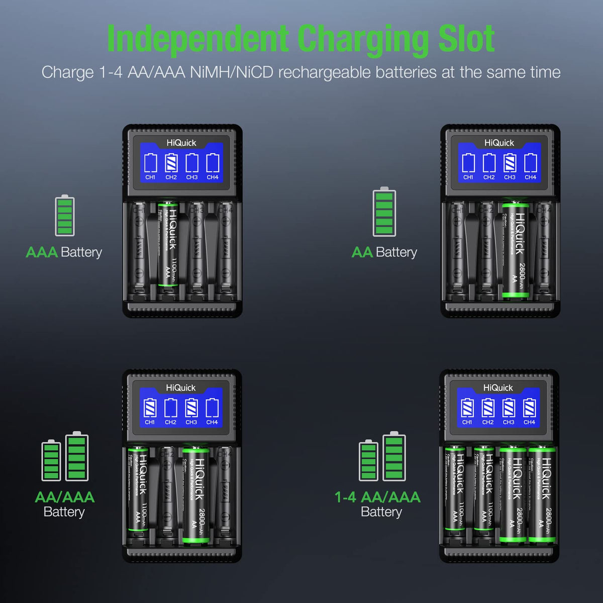 Hiquick 4 Bay Aa Aaa Battery Charger, Usb Input Fast Charging And Independent Charging Slot With Smart Lcd Display Battery Charg