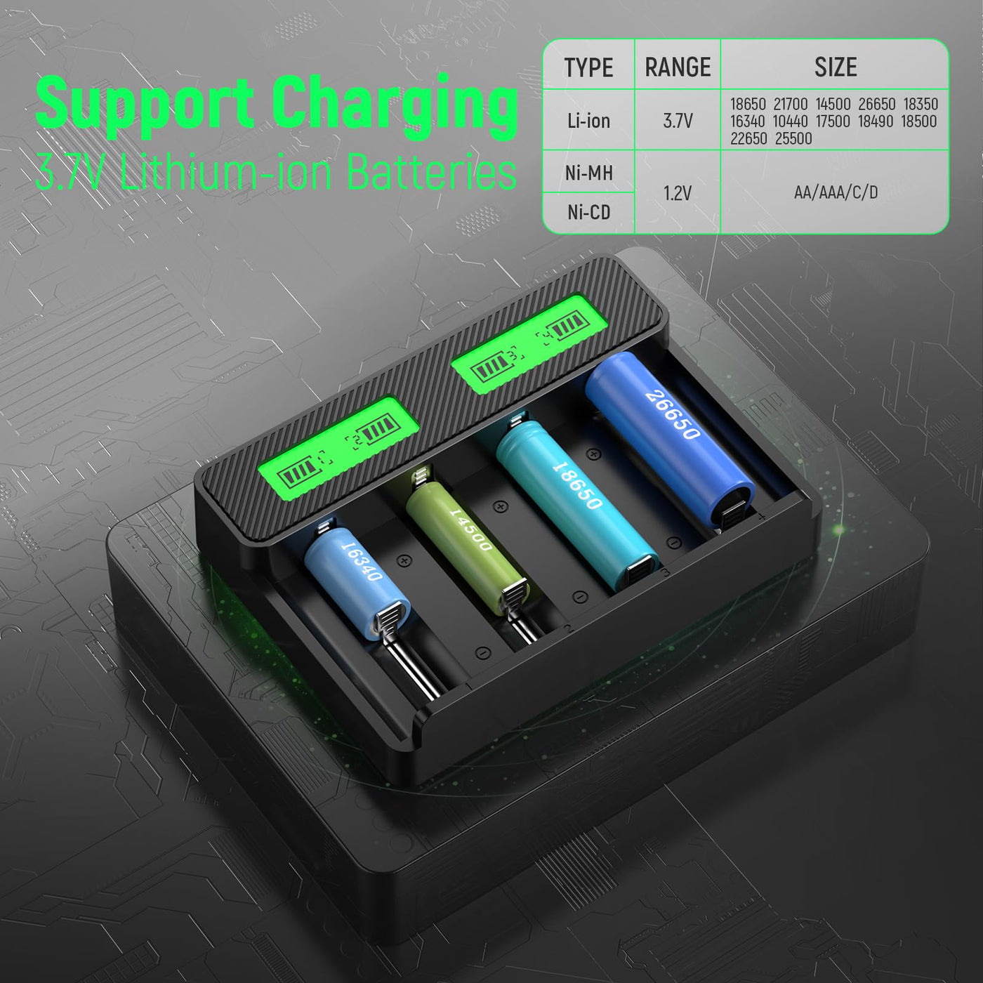 Q: What types of batteries can the HiQuick charger charge?A: The HiQuick charger is a universal battery charger that supports various types of batteries, including 1.2V NiMH Ni-CD AA, AAA, C, D batteries, and 3.7V lithium-ion batteries such as 18650, 21700, 14500, 26650, 18350, and more. However, it does not support flat top batteries.