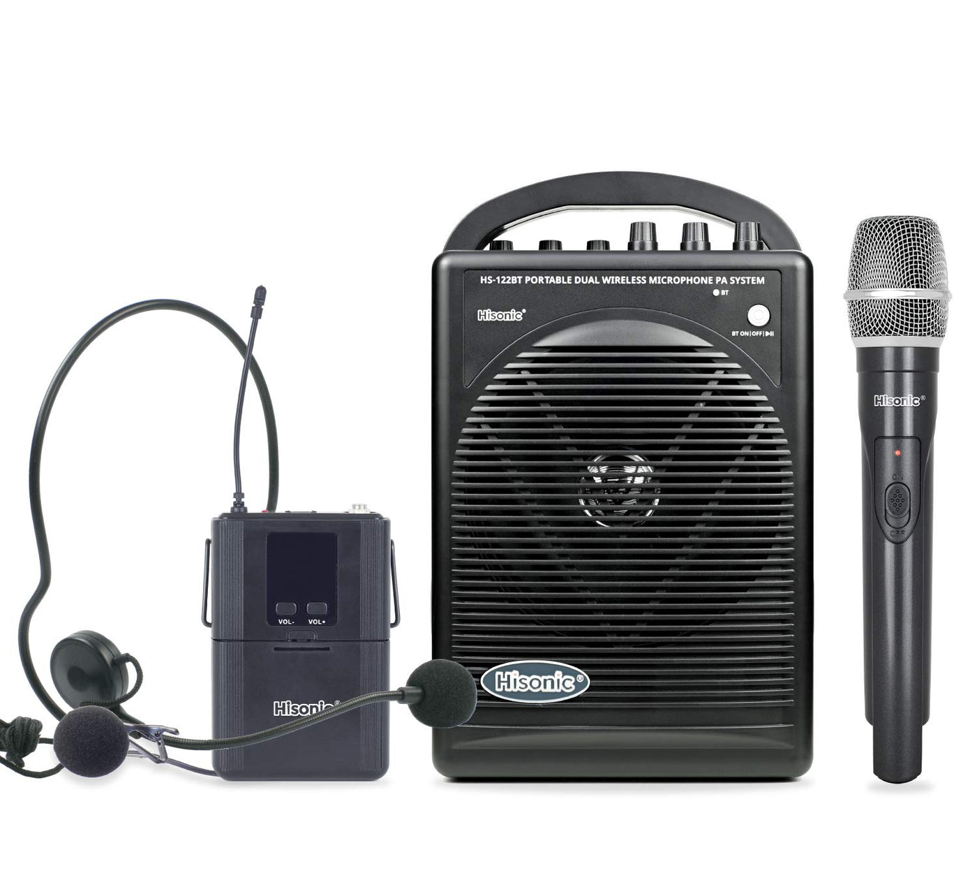 Hs122Bthl, Seamlessly Combined A Powerful 40 Watts Speaker & Dual Channel Vhf Wireless Microphone System Into One Compact & Lightweight Portable Pa System, The Hs122Bthl Has Everything Needed For Sound Amplification, The Sound Can Be Streamed From A Bluetooth From Your Cellphone. No Assembly Required! No Extra Equipment To Purchase! Open The Box And Switch It On, Let The Show Begin! Powered By A 12V/2,200Mah Li-Ion Rechargeable Battery, The Hs122Bthl Can Be Used Continuously For Up To 12 Hours When Fully Charged, Ideal For Small Or Large Events, Indoor Or Outdoor. A Power Cord Is Included For Charging The Battery And Powering The Unit While Its Plugged In. For Added Convenience, A 12V Dc Power Cord Is Also Included For Using In A Car. Built-In With A Vhf Wireless Receiver, The Hs122Bt-Hl Include A Total Of Three Microphones, A Handheld Microphone, A Belt-Pack Transmitter With A Headset Or A Lapel To Choose. In Addition, The System Has Two Microphone Inputs For Additional Microphones. Better Yet, The Hs122Bthl Is Equipped With Bluetooth For Wireless Streaming Music From Any Devices Such As Your Mobile Phone, Notebook, Ipod Or Ipad. An Auxiliary Input Is Also Available For Connecting An External Audio Device, Such As An Mp3 Player, To The Speaker With A Cable (Not Included). With Its Versatility And Portability, This System Is An Ideal Companion And Indispensable Tool For Professionals Such As Teachers, Auctioneers, Street Performers, Studio Instructors And Alike. Specifications: Frequency: 174.00 Mhz-216 Mhz Input Power: Ac 110V/60Hz Vhf Wireless Microphone Transmission Range: 100 Feet, Communication Range: 30 Feet Dimensions: 11'' X 7'' X 4 '' Net Weight: 4 Lb (Speaker) Accessories: Wireless Handheld Microphone Wireless Belt-Pack Transmitter Lapel Mic Headset Mic User Manual 9V Battery: Ac Power/Charging Cord, 12V Dc Power Cord Carrying Bag