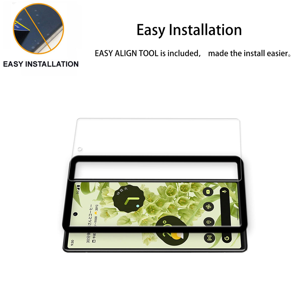 Q: How do I install the tempered glass screen protector using the alignment frame?A: Installation is simple: just align the frame with your Google Pixel 6, place the tempered glass screen protector in the frame, and press down for a bubble-free application.