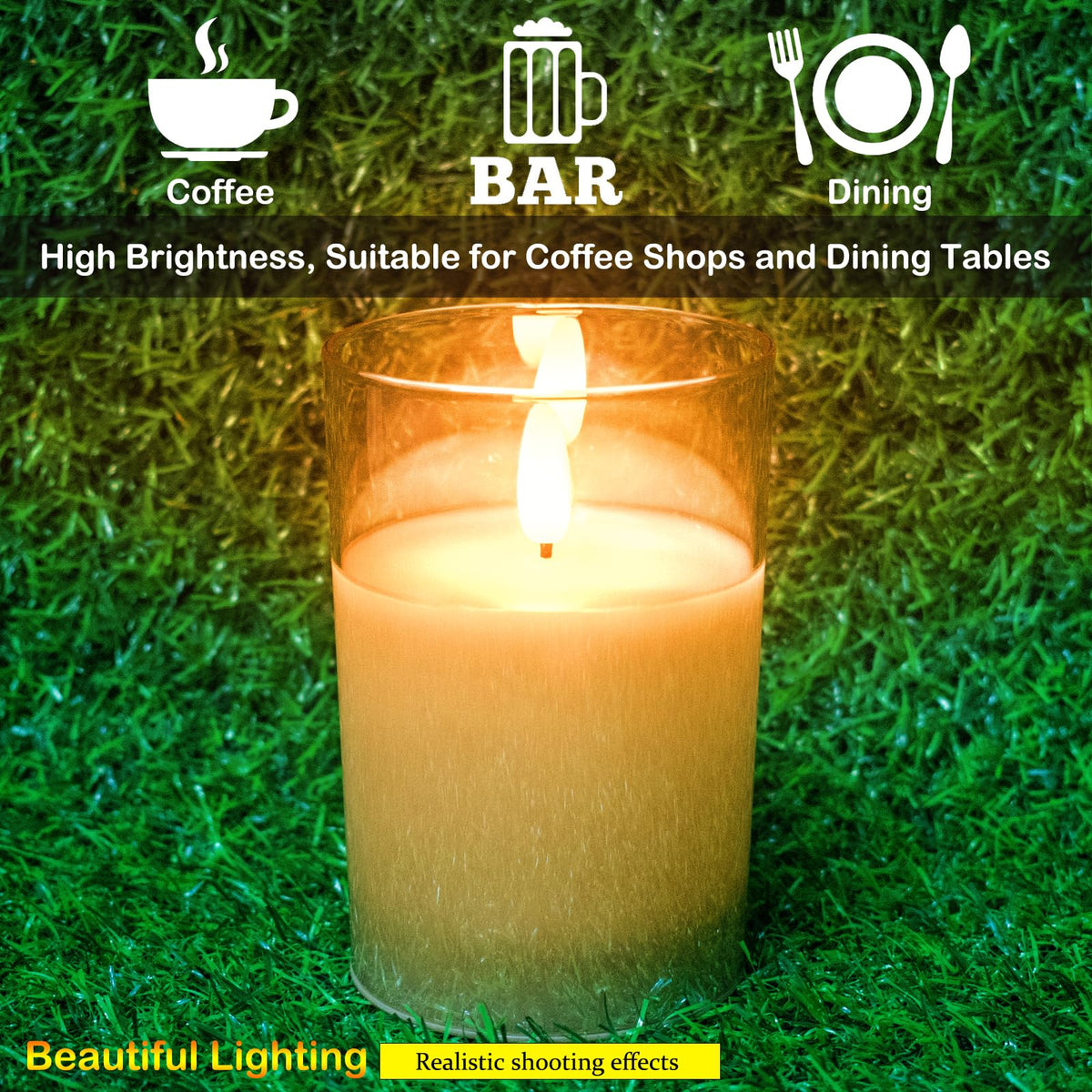 Q: What is the size of each candle in the set?A: Each candle in the HL Gold Glass Flameless Candles set has a diameter of 3 inches and comes in three heights: 4 inches, 5 inches, and 6 inches, making them versatile for various decorative uses.