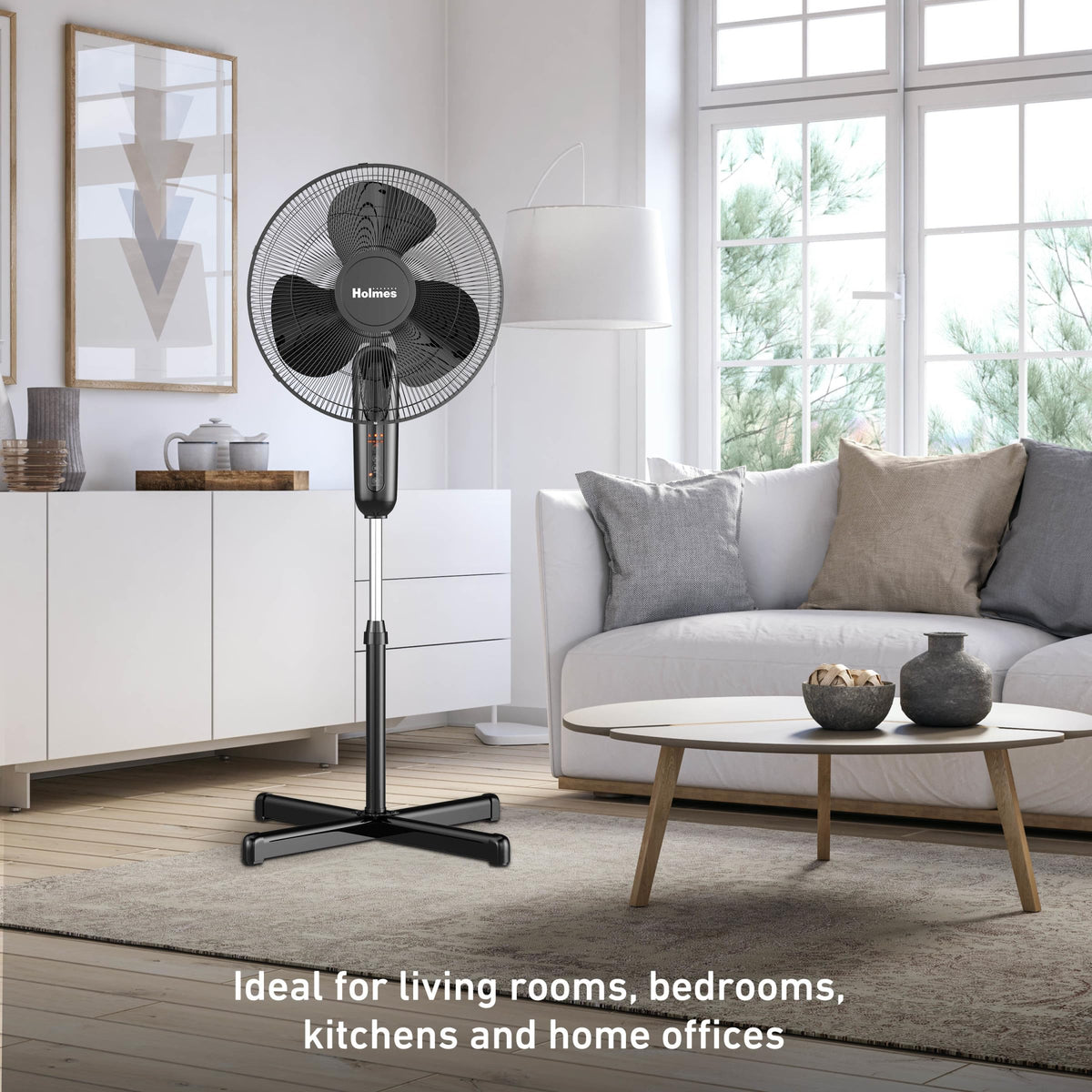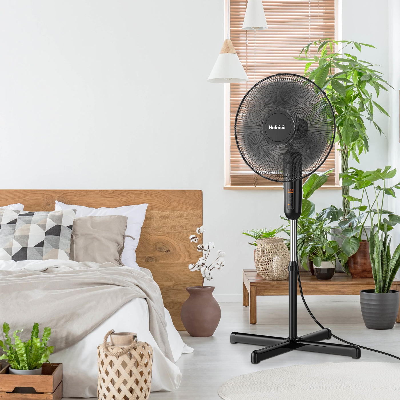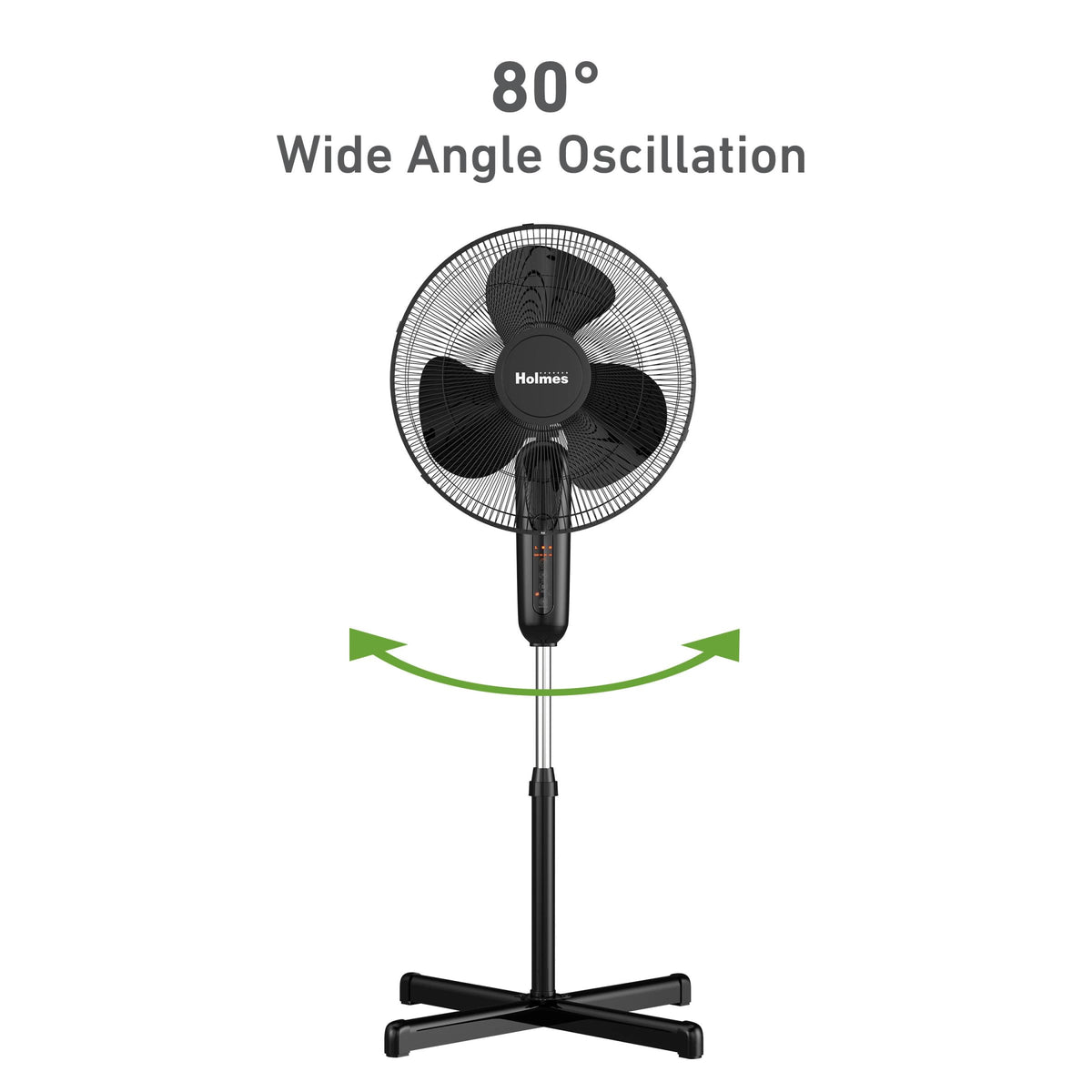 Holmes 16 Oscillating Digital Stand Fan Takes Your Cooling Experience To New Heights. With 3 Speed Options And Easy To Use Digital Controls, You Can Select From Low, Medium, Or High Settings For A Customized Cooling Experience. This Fan Features A Motorized 80 Wide Angle Oscillation That Delivers Cooling Airflow For Larger Living Areas And 3 Operating Modes: Normal, Sleep And Breeze. The Fan Head Can Be Tilted To Up To 30 And The Height Can Be Adjusted From 37'' To 44'' To Ensure You Can Direct Airflow Where You Need It The Most. This Pedestal Fan Features An Up To 7.5 Hour Auto Shut-Off Timer To Conveniently Turn Off The Fan. With An Output Of 1,700 Cubic Feet/Minute And High-Speed Velocity Of 16.4Ft/Sec, This Fan Is Ideal For Use In Living Rooms, Kitchens, Bedrooms, Gyms And Home Offices. It Features A Sturdy Cross Metal Base, Modern Black Finish, And 3-Year Limited Warranty.