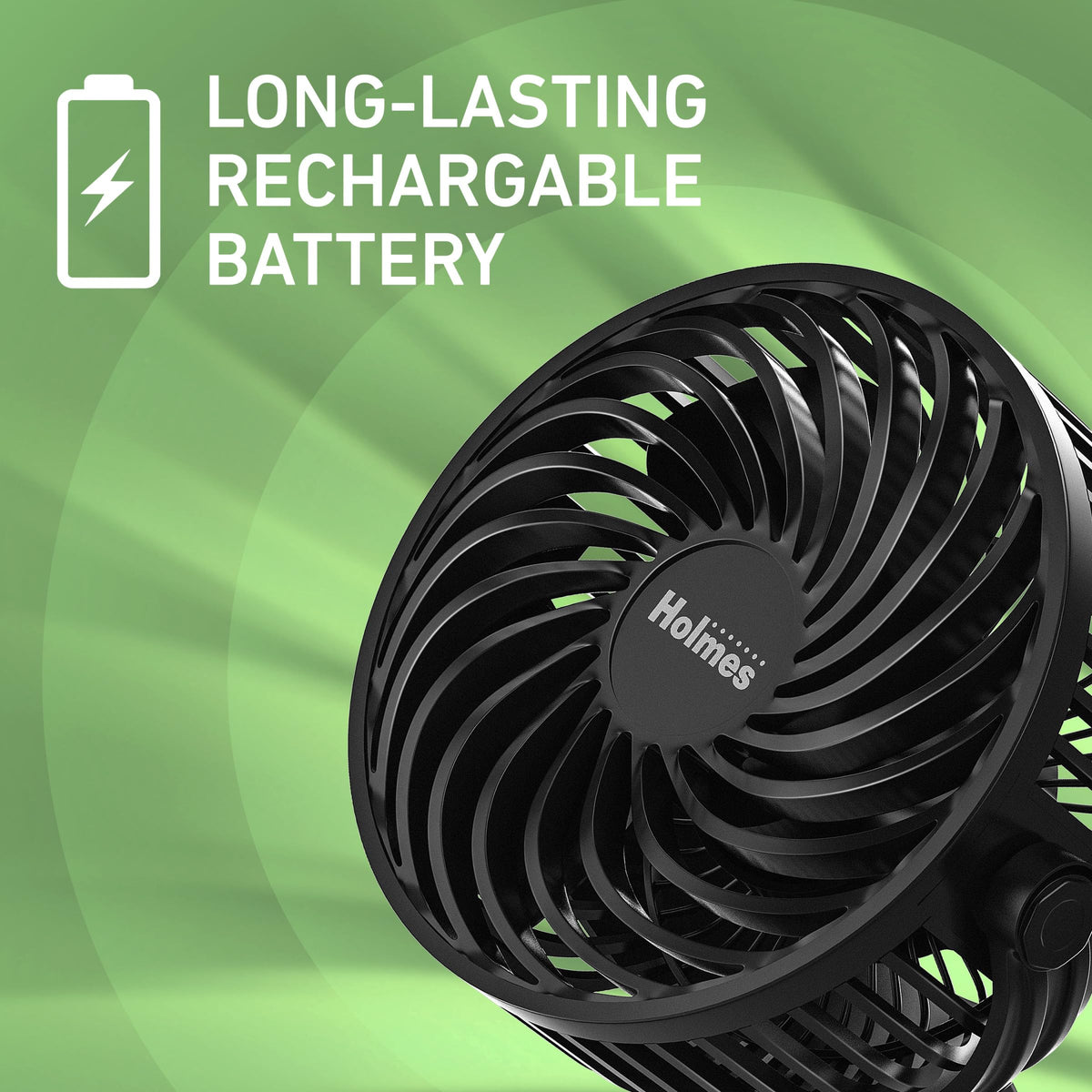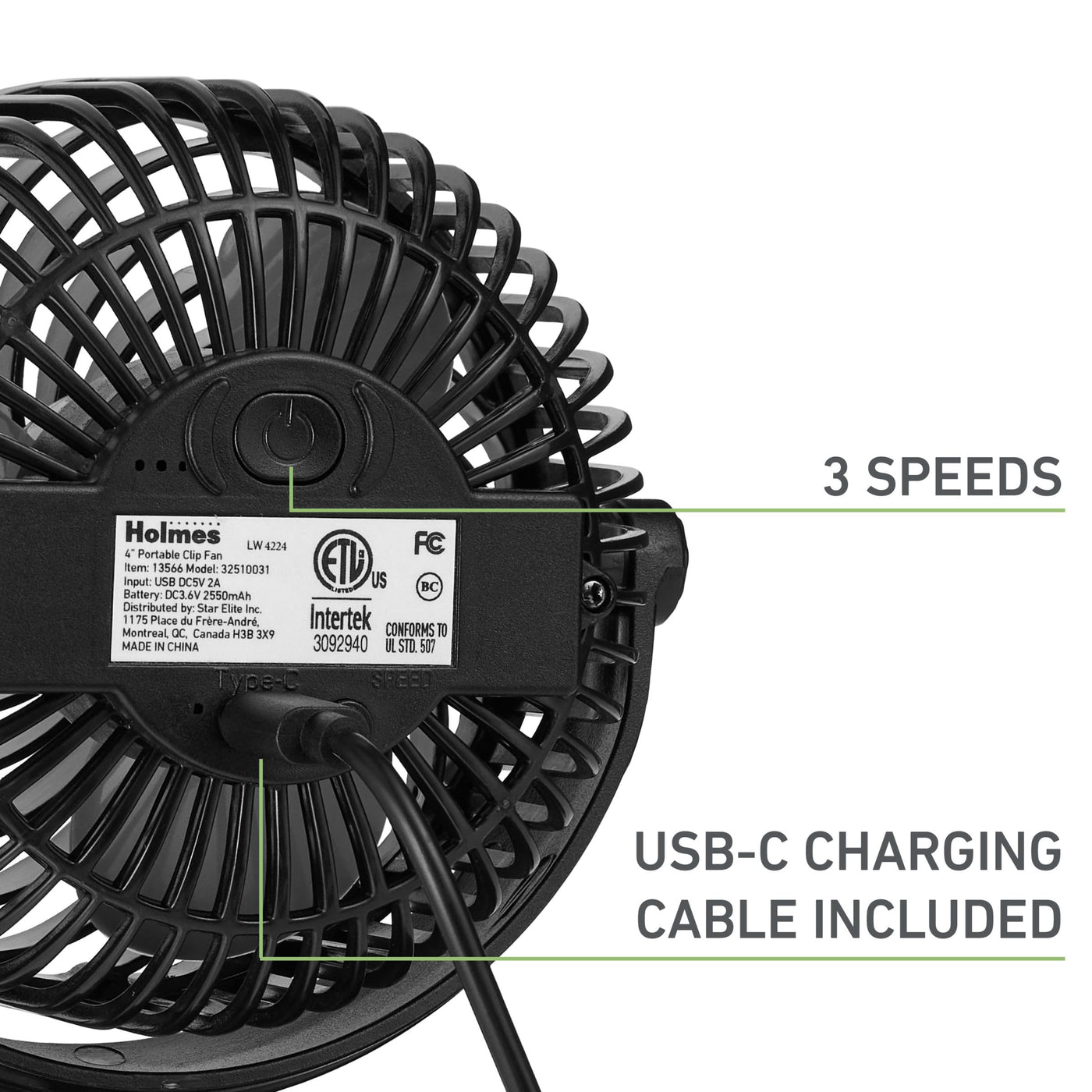 Holmes 4 On-The-Go Personal Fan Makes Cooling Your Personal Spaces Effortless. Compact And Powerful, This Portable Fan Is Perfect For Use Wherever You Need A Breeze. Equipped With A Long-Lasting Rechargeable Battery, It Provides Up To 5 Hours Of Cooling On The Lowest Speed Setting, And Includes A Usb-C Charging Cable For Convenient Recharging. Whether You Need It On A Desk, Bedside Table, Or Shelf, The Fan Can Easily Rest On Tabletops Or Be Securely Clipped Onto Surfaces Like Desks, Bedframes, Or Shelves. The 360 Adjustable Head Allows You To Direct Airflow Both Vertically And Horizontally, Ensuring Optimal Cooling Exactly Where You Need It. Choose From 3 Speed Settings-Low, Medium, And High-For A Fully Customizable Cooling Experience. This Fan Is Ready To Use Right Out Of The Box With No Assembly Required. Featuring A Sleek Black Finish And Backed By A 1-Year Limited Warranty, Its The Perfect Personal Fan For Any Space.