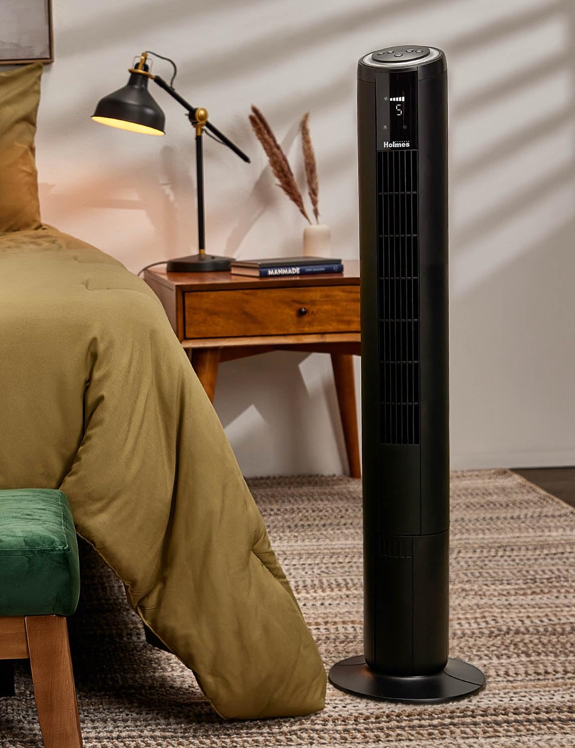 Holmes 42� Digital Tower Fan Makes Cooling Your Home A Breeze. It Features A Clearread Lcd Display To Easily Operate The Fan And Adjust The Settings. Includes 5 Speed Options, Up To 19.7 Ft/Sec High-Speed Velocity, And 4 Operation Modes; Normal, Sleep, Breeze, And Power Breeze To Customize Your Cooling Experience. This Slim, Compact Tower Fan Is Ideal For Larger Living Areas Where Floor Space Is Limited, Including Bedrooms, Kitchens, Living Rooms And Home Offices, Includes An Integrated Carrying Handle To Easily Move From One Room To The Next. Rest Easy With The Soothing Sleep Mode Option And Up To 8 Hour Auto-Shut Off Timer To Conveniently Turn Off The Tower Fan. Motorized 90� Oscillation Delivers Cool Airflow For Wide Areas And The Convenient Remote Control Lets You Operate The Fan'S Features From Across The Room. It Features A Sturdy Base, Matte Black Finish And 3-Year Limited Warranty.