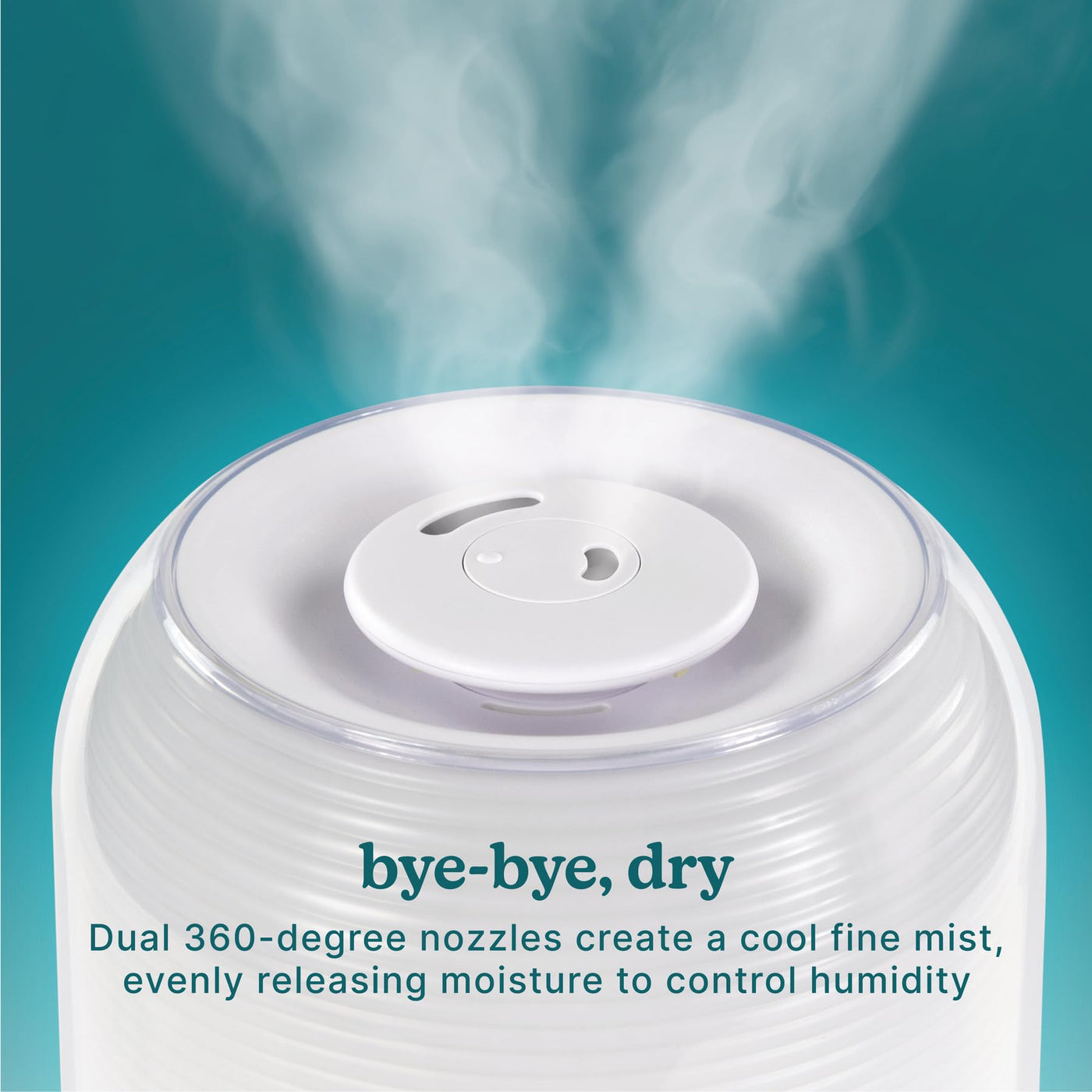 Relieve Dryness: Dual 360-Degree Mist Nozzles Disperse Visible Ultrasonic Cool Mist To Combat Dry Air | Top Fill Tank: 0.79-Gallon (3L) Easy-Clean Tank Delivers Up To 35 Hours Of Cool Mist | Happy Home: Coverage Area Up To 395 Sq. Ft.* - Great For Bedrooms And Home Offices *Based On Aham Standard Hu-1-2016 Measurement As Shown By Independent Laboratory Testing. | Relaxing Features: 3 Mist Settings, Auto-Off Timer, Auto Shutoff When Out Of Water, Clean Tank Technology | Sleep Soundly: Optional Night-Light With 3 Brightness Levels, Plus Whisper-Quiet Operation At 26.5 Dba | What