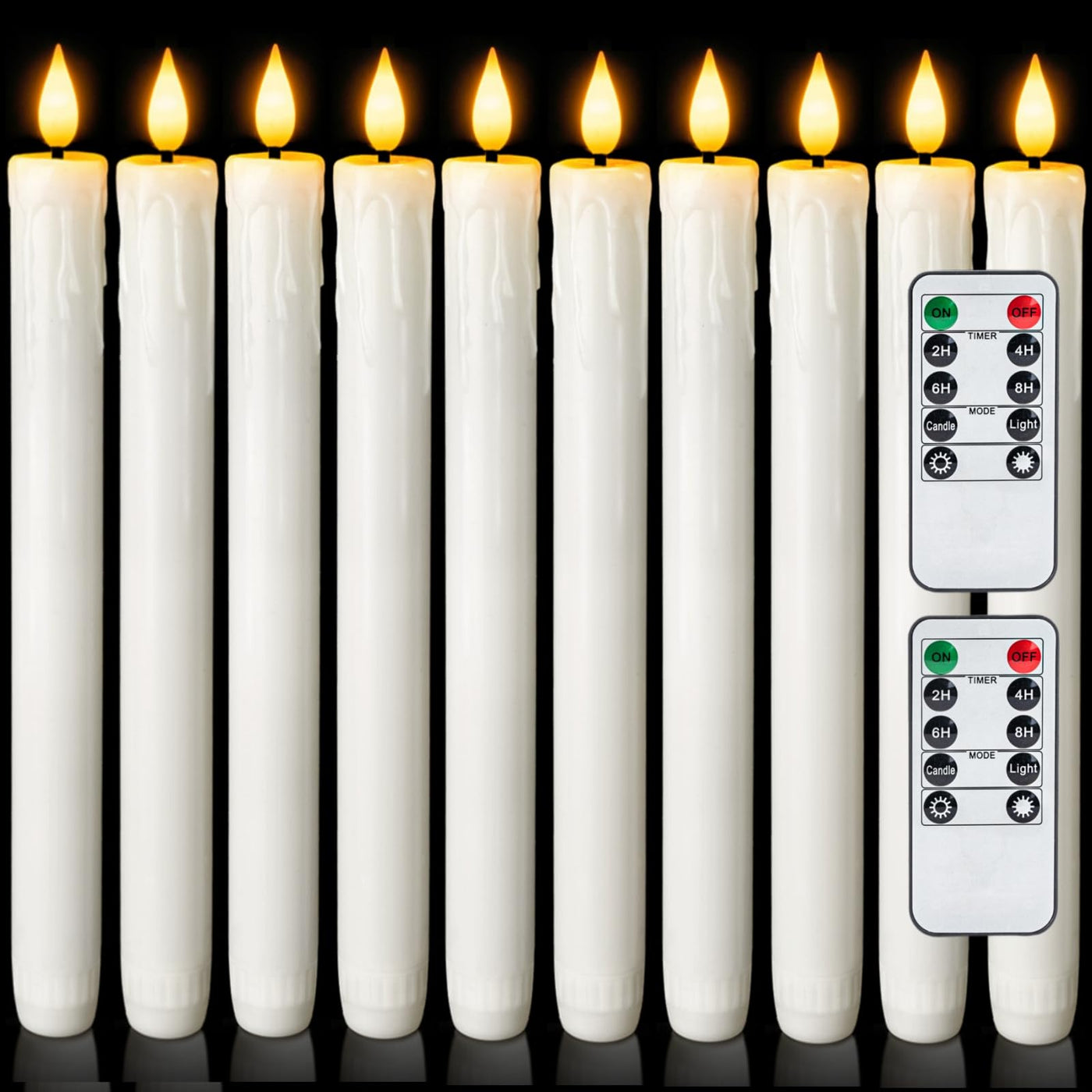 Homemory 12 Pcs Real Wax Flameless Taper Candles with Remote Timer and Dimmer, Battery Operated Candlesticks with Flickering Light, White Window Candles, 9.6 Inches for for Wedding Home Decor
