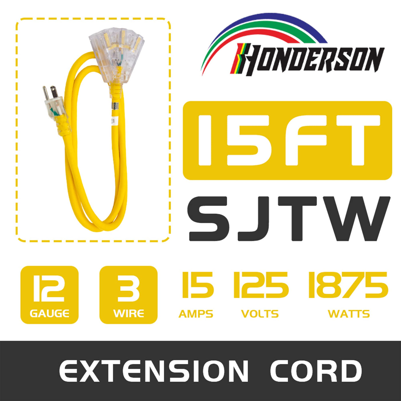 Honderson 15 Ft Lighted Outdoor Extension Cord With 3 Power Outlets,12/3 Sjtw Heavy Duty Yellow Extension Cable With 3 Prong Gro