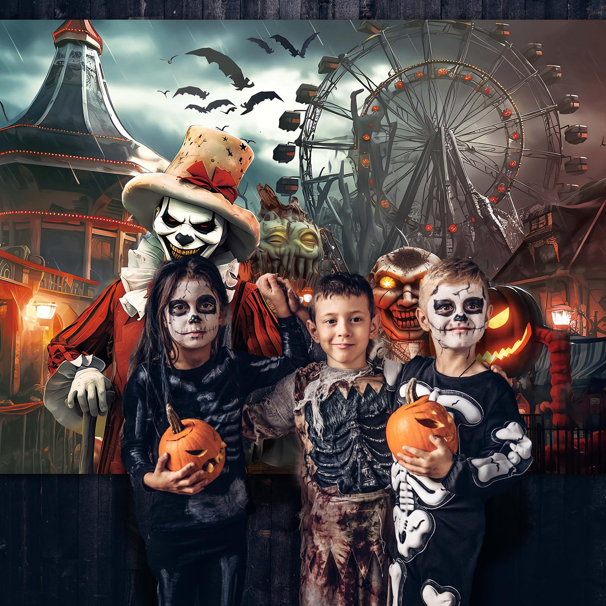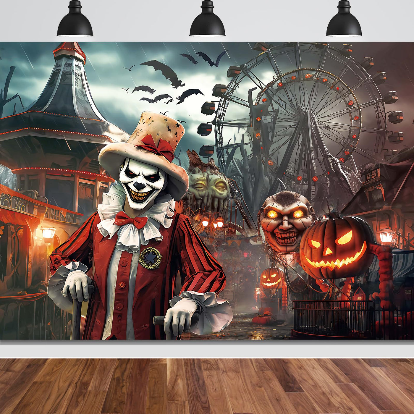 Q: What size is the Horror Circus Halloween Backdrop?A: The Horror Circus Halloween Backdrop measures 7x5 feet (84x60 inches), making it an ideal size for various party decorations and photo booth setups.