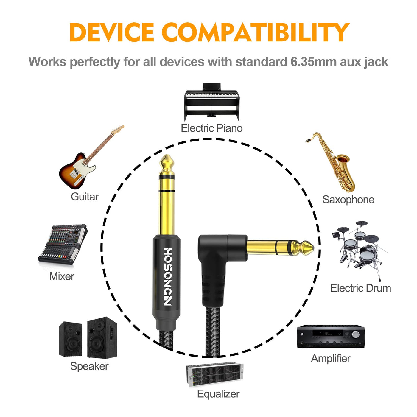 Q: What devices are compatible with the HOSONGIN 1/4 Inch TRS Instrument Cable?A: The HOSONGIN 1/4 Inch TRS Instrument Cable is universally compatible with a variety of devices, including electric guitars, bass guitars, keyboards, amplifiers, mixers, and speakers that feature a 6.35mm audio interface.