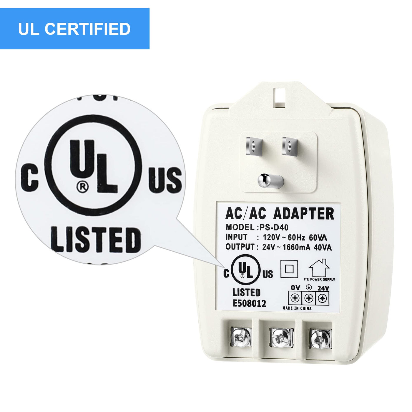 No More Doorbell/ Thermostat Underpower Hassel: 24V 40Va Plug In Transformer, Replaces And Upgrades Underpowered Transformer With This 24V Ac Transformer, Offering Plenty Of Power For Your Thermostats And Doorbells. Specification: Input Voltage: 120 Vac, 60Hz Output Voltage: 24V, 40 Va Safe And Stable: Auto-Resetting (Ptc) Fused Secondary Led Green Power Indicator Positive/Negative/ Screw Terminals Ul Certified: (E508012, Model Ps-D40) Ul Certification Passed Easy Installation: Electrical Outlet Mounting Tab Universal Compatibility: This 24V Transformer Is Compatible With Ring Video Doorbell, Ring Video Doorbell 2, Ring Video Doorbell Pro, Nest Skybell Doorbell, Also Compatible With Nest, Ecobee, Honeywell And Sensi Smart Thermostats, And Other Devices That Require Constant 24 Volt Power For Operation. Note: The Brand Above Is Only For Demonstrating Compatibility.