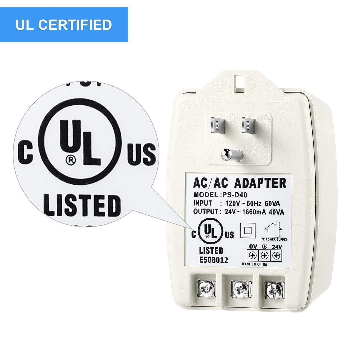 No More Doorbell/ Thermostat Underpower Hassel: 24V 40Va Plug In Transformer, Replaces And Upgrades Underpowered Transformer With This 24V Transformer, Offering Plenty Of Power For Your Thermostats And Doorbells. Specification: Input Voltage: 120 Vac, 60Hz Output Voltage: 24V, 40 Va Safe And Stable: Auto-Resetting (Ptc) Fused Secondary Led Green Power Indicator Positive/Negative/ Screw Terminals Ul Certified: (E508012, Model Ps-D40) Ul Certification Passed Easy Installation: Electrical Outlet Mounting Tab Universal Compatibility: This 24V Transformer Is Compatible With Ring Video Doorbell, Ring Video Doorbell 2, Ring Video Doorbell Pro, Nest Skybell Doorbell, Also Compatible With Nest, Ecobee, Honeywell And Sensi Smart Thermostats, And Other Devices That Require Constant 24 Volt Power For Operation. Note: The Brand Above Is Only For Demonstrating Compatibility.