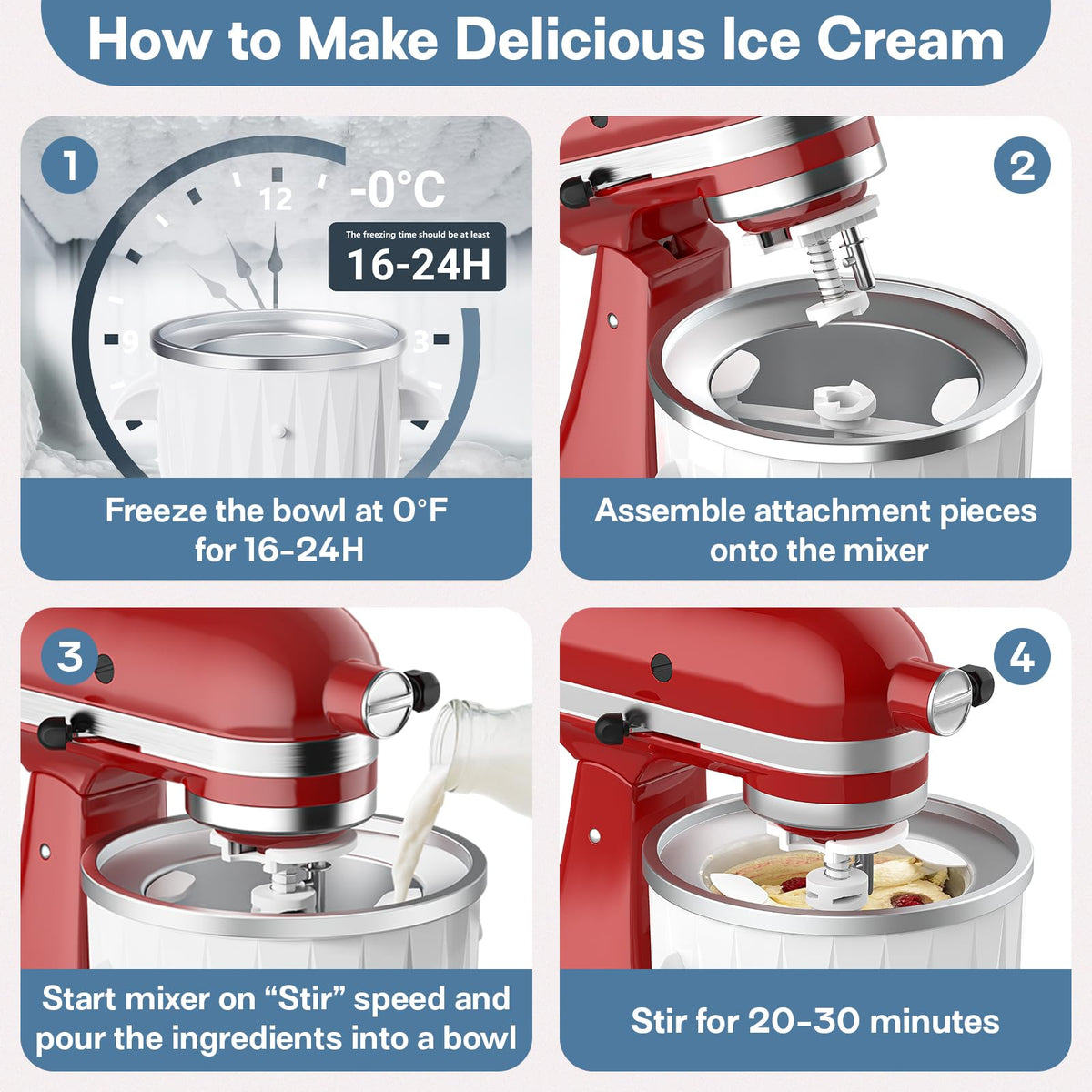 Q: How do I use the Hozodo Ice Cream Attachment for best results?A: To use the Hozodo Ice Cream Attachment, freeze the bowl at 0°F for 16-24 hours in advance. Assemble the attachment onto your mixer, pour in the ingredients, and churn for 20-30 minutes. The included ice cream scoop makes serving easy.