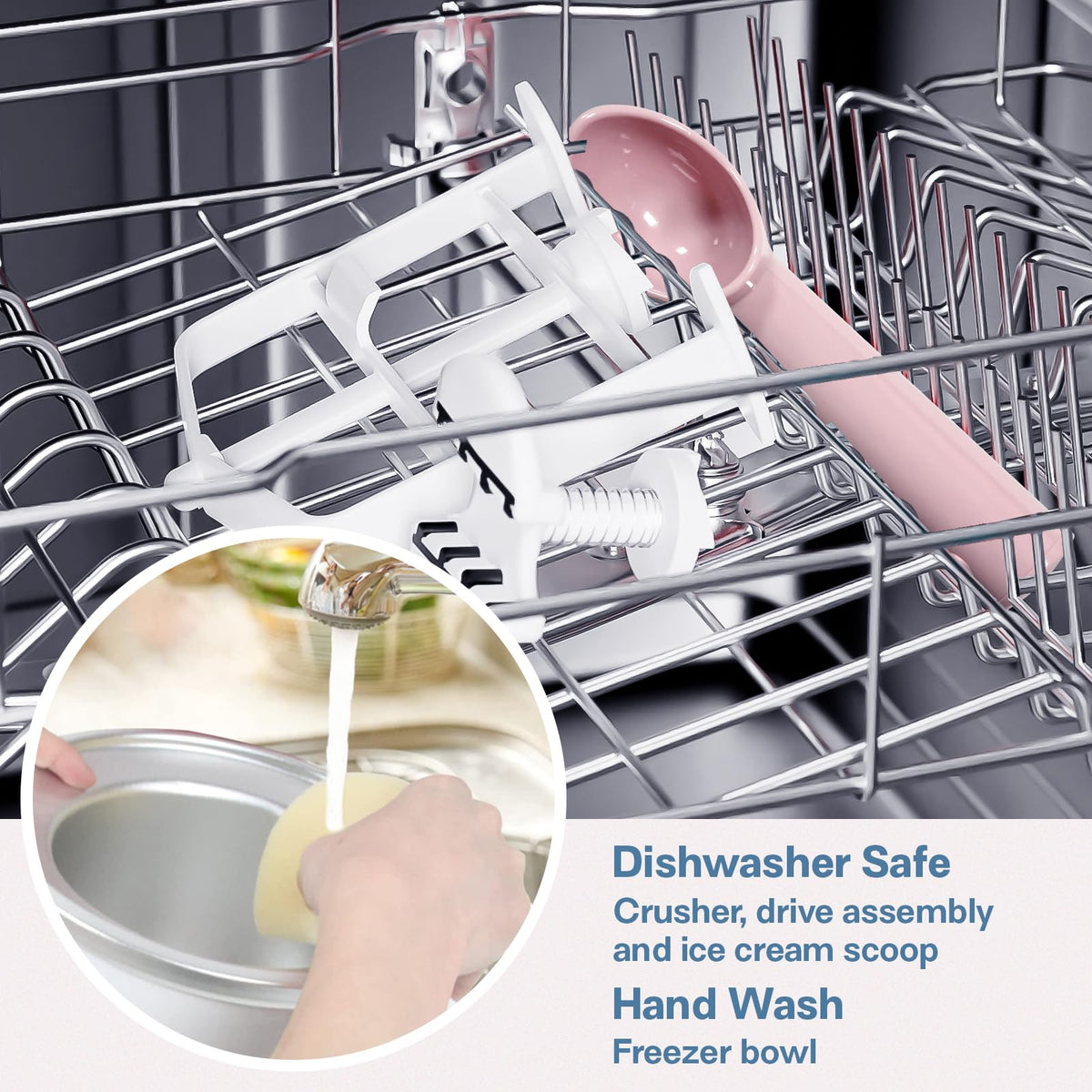 Q: How do I clean the Hozodo Ice Cream Attachment?A: The crusher, drive assembly, and ice cream scoop of the Hozodo Ice Cream Attachment are top rack dishwasher safe. The freezer bowl should be washed with mild water and thoroughly dried before being placed in the freezer.