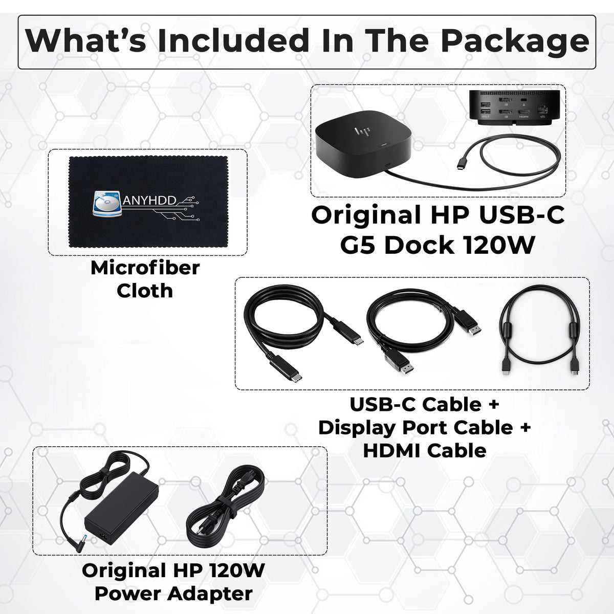 Elevate Your Workspace With The Hp Usb C Dock G5-8 In 1. This Usbc Docking Station Simplifies Your Setup, Reduces Clutter, And Offers Universal Compatibility With Both Hp And Non-Hp Usb-C- And Thunderbolt-Enabled Laptops, Pcs, And Macbooks, Including Windows 10, Windows 11, Macos, And Chrome Os. Universal Compatibility Seamlessly Connects To A Range Of Laptops, Including Hp And Non-Hp Brands. Comprehensive Connectivity Features A Variety Of Ports For Versatile Use, Including 1 Usb 3.0 Type-C Port (15W), 4 Usb 3.0 Type-A Ports, 2 Displayport 1.4 Ports, 1 Hdmi 2.0 Port, 1 Rj45 Ethernet Port, And 1 3.5Mm Combo Audio Jack. Steadfast Display Performance Enjoy Flicker-Free Visuals On Multiple Monitors, Ensuring A Clear View. Dependable Ports And Peripherals Reliable Connections And Efficient Data Transfer, Even With Multiple Usb Ports In Use. Efficient Power Delivery Provides Up To 100W Of Power Via Usb-C, Ensuring Consistent Device Performance And Charging. Security And Warranty Integrated Lock Slot Enhances Device Security, Backed By A One-Year Limited Warranty. In Addition To This, Our Package Includes A Docking Station, Microfiber Cloth To Maintain Cleanliness, An Hdmi Cord For Seamless Visuals, And An Adapter With Its Cable For Versatile Device Connectivity. Experience A Productive, Organized, And Clutter-Free Workspace With The Hp Usb C Docking Station. Elevate Your Work Environment Today. What'S Included In The Package: Hp Usb-C Dock G5 New Hp 1230W Adapter 1X Hdmi Cable 1X Displayport Cable 1X Usb Type-C Cable Anyhdd Microfiber Cloth