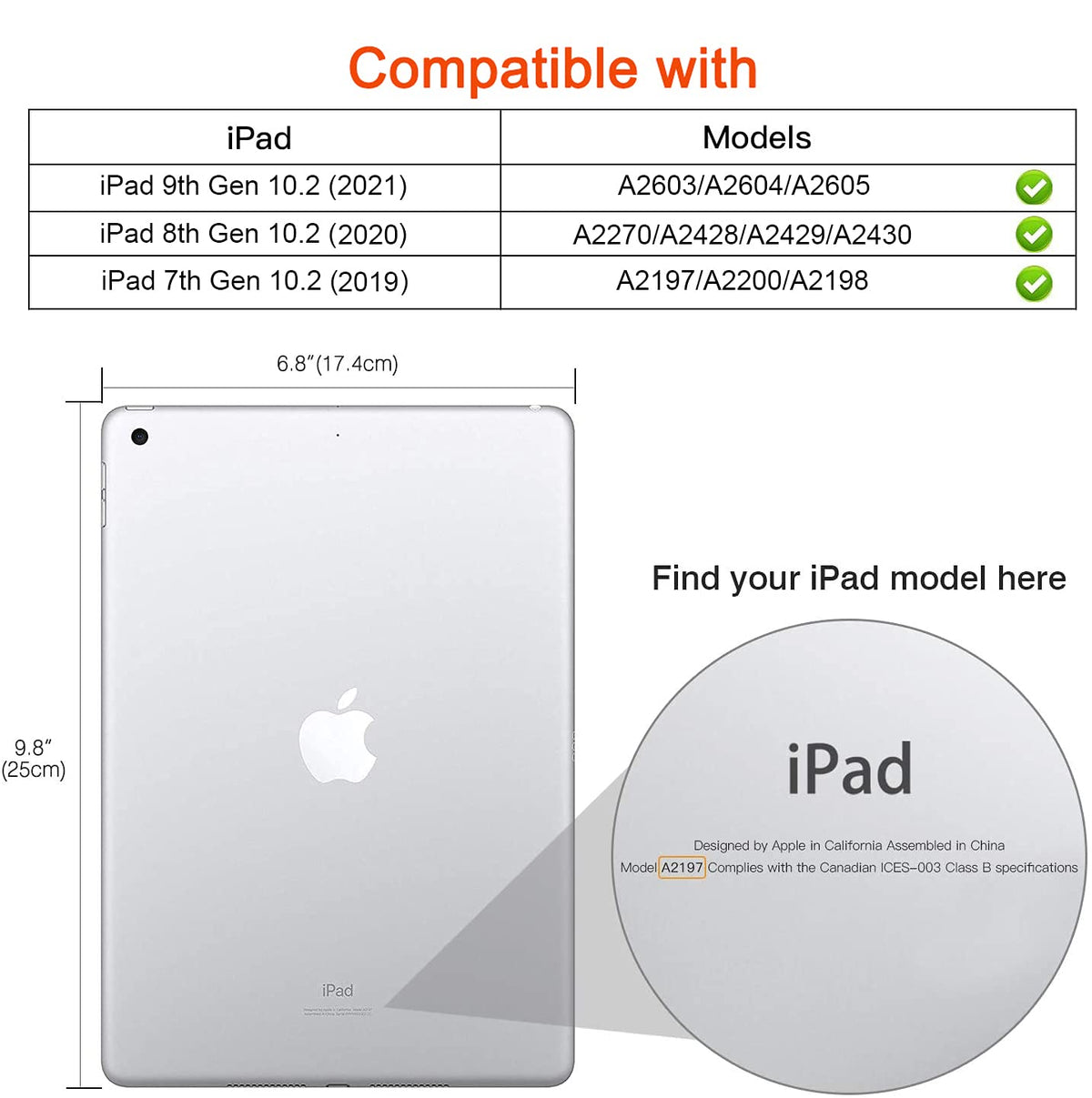 Description: 1Specially Designed For New Ipad 9Th Generation 2021 (Model Number:A2603/A2604/A2605), Ipad 8Th Generation 2020 (Model Number:A2270/A2428/A2429/A2430), Ipad 7Th Generation 2019 10.2'' Tablet (Model Number: A2197/A2200/A2198). 2.It Protects Your Tablet And Can Act As A Stand For Hands-Free Typing, Reading And Viewing Function . 3.360 Rotating Case Is Designed To Provide Maximum Protection For Your Smart Device While Giving Your Ipad The Unique Appearance. 4.Hard Case With A Front Cover & 3 Stand Position For Multiple Viewing Angles. The Reading Or Viewing At Different Angles Ideal For Watching Videos, Typing Or Messaging. 360-Degree Rotating : Making It Simple To Transition Between Landscape And Portrait Options, The 360-Degree Feature Allows For More Viewing Versatility While Keeping Your Device In The Case. Scratch-Resistant Lining : This Soft-To-The-Touch Material Is Designed To Help Prevent Scratches On Sensitive Accessories Such As Sunglasses Or Mobile Phones For Worry-Free Travel . Size Guide: Models: A2603/A2604/A2605/A2270/A2428/A2429/A2430/A2200/A2197/A2198(On The Back) Package Content: 1 Ipad Case (Not Including Tablet) 300 Day Satisfaction Guarantee: All Our Products Are Guaranteed To Give You 100% Satisfaction In Every Way For 300 Days From The Date Of Purchase. If You Have Any Question About Our Products Or Service, Please Contact Us, We Will Reply In 24 Hours, Thanks.