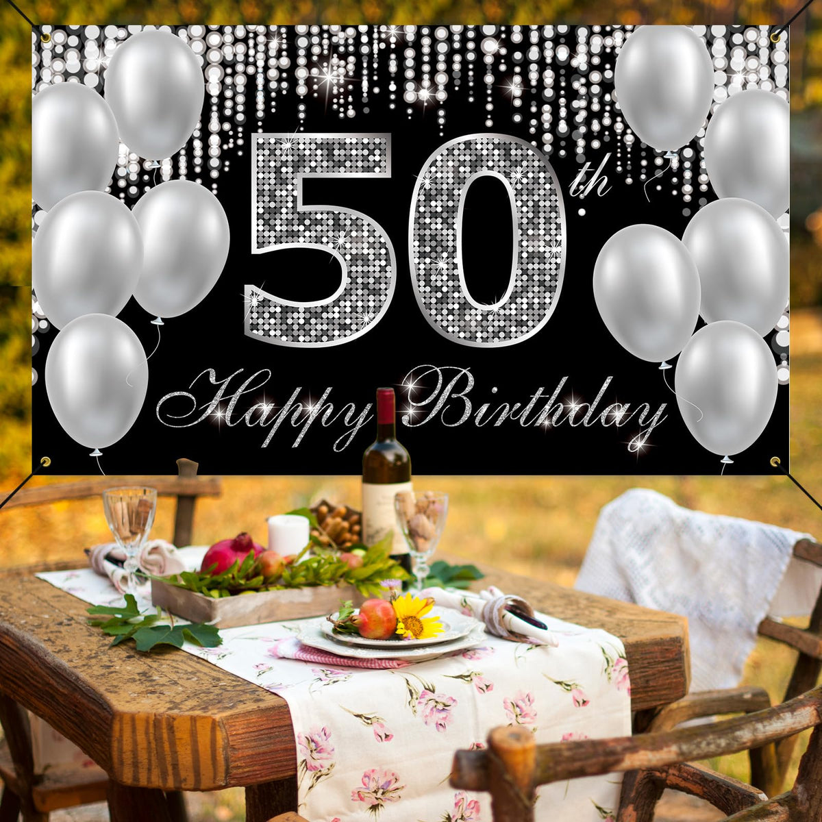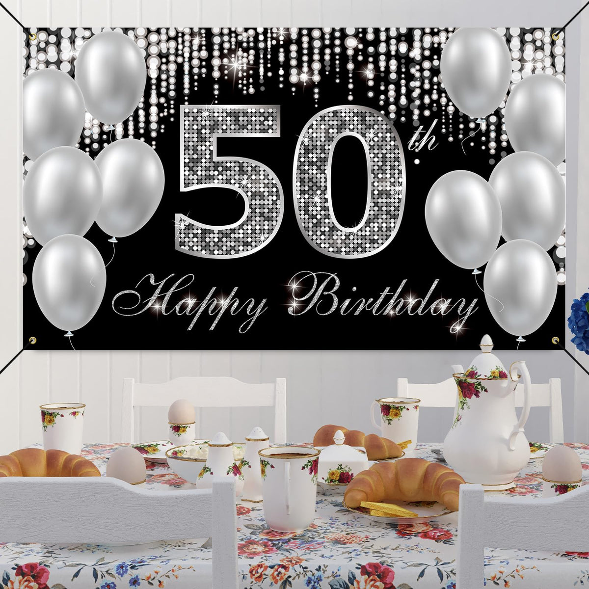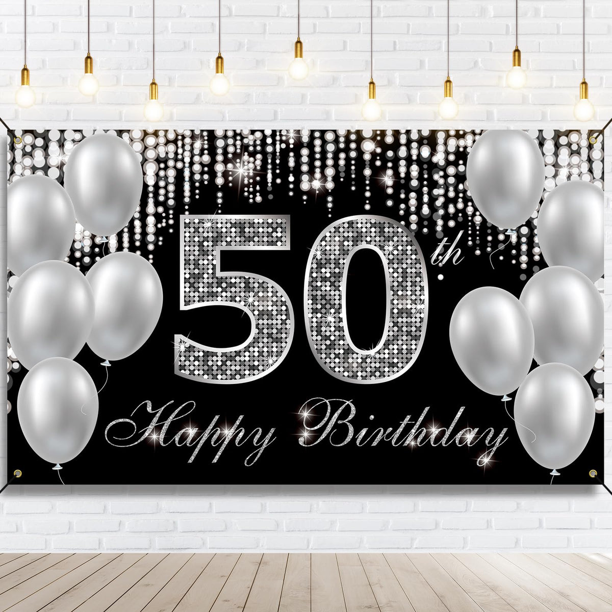 Htdzzi 50Th Birthday Banner Backdrop, Happy 50Th Birthday Decorations For Women Men, Black Silver 50 Year Old Birthday Party Yar
