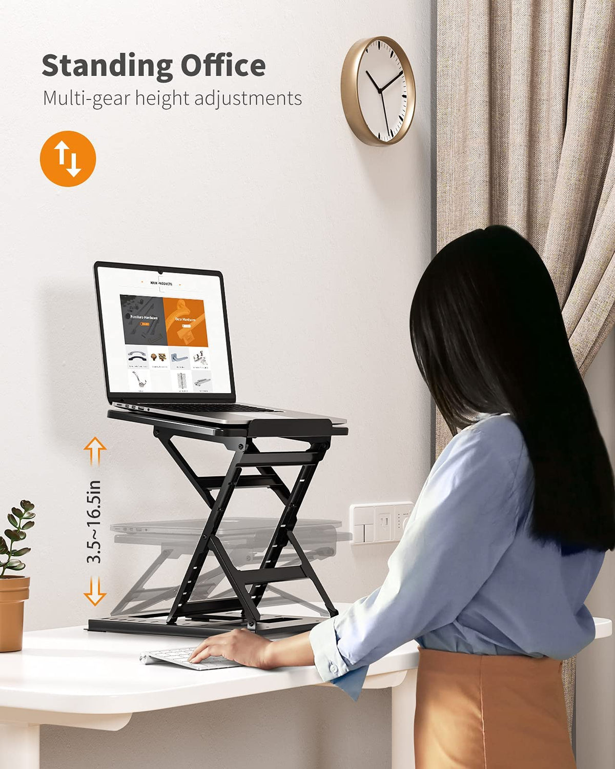 Q: What is the maximum height adjustment for the HUANUO Adjustable Laptop Riser?A: The HUANUO Adjustable Laptop Riser can be adjusted from 3.5 inches to a maximum height of 16.5 inches, allowing users to find a comfortable position for both sitting and standing.