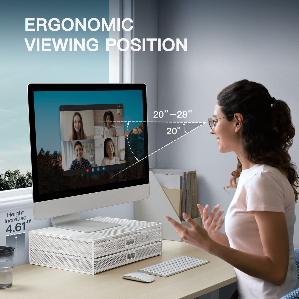 Huanuo Monitor Stand Riser With Drawer Mesh Metal Desk Organizer Pc, Laptop, Notebook, Printer Holder With Pull Out Storage Drawer (White)