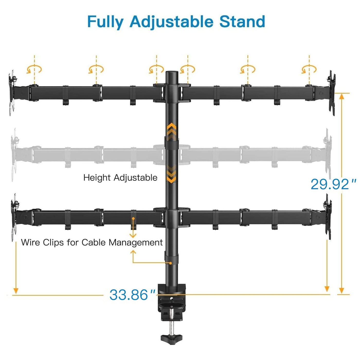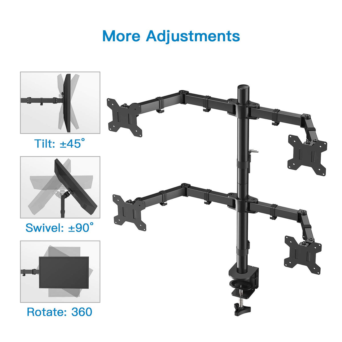 Get A Huanuo Quad Monitor Stand To Help Clear Up Valuable Work Space On Your Desk!Constructed From High-Grade Steel, This Stand Was Built To Resist Scratches And Supports 4 Lcd Screens Up To 17.6Lbs And 27'' In Size Per Each Arm! Our Sturdy And Ergonomic Design Offers A Variety Of Features Including Heavy-Duty C-Clamp Mounting, Easy Height And Angle Adjustment, Removable Vesa Mounting Plates, Integrated Cable Management And More.Two Mounting Optionsthe Solid Steel Construction Keeps Your Monitors Secure. The Heavy-Duty C-Clamp Attaches To Desks Up To 4'' Thick, Which Also Helps Clear Up Valuable Desk Space While Providing Excellent Support For The Entire Mount And Four Screens. Optional Grommet Mounting Base Creates Excellent Stability And Fits Desks Up To 3 Thickfull Motion Monitor Standfinding The Optimal Viewing Angle With Its Full Articulating Arms Is A Breeze. This Fully Adjustable Monitor Mount Offers -90To +90Tilt, -90To +90Swivel, 360Rotation, And Height Adjustable Along 31.7 Center Pole.Removable Vesa Plate Mounting Your Monitor With A Detachable Vesa Plate Is Super Easy To Do. Simply Connect The Removable Vesa Heads To The Back Of Your Monitor And Slide Into The Stand. And Its Able To Raise Or Lower The Height Of Each Monitor. This Eliminates The Annoyance Of Unaligned Monitors. Cable Management Comes With Detachable Cable Clips On The Arms And Center Pole That Neatly Keeps Your Messy Cords Clean And Organized. All The Necessary Tools And Hardware Are Provided For Quick Assembly.Specifications Supports Screens 13'' To 27'' Pole Height: 31.7 Vesa Standard: 75X75Mm And 100X100Mm Tilt: -45To +45 Swivel: -90To +90 Rotation: 360 Weight Capacity: 17.6Lbs Per Arm
