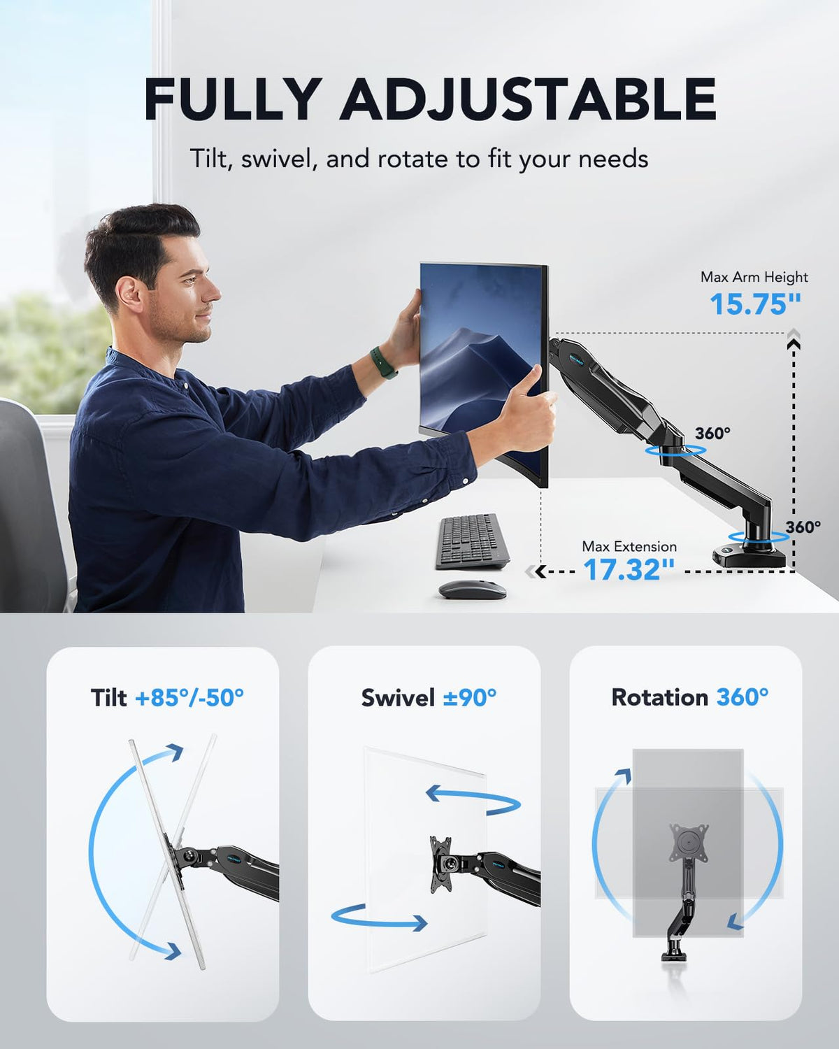 Full Motion For Better View - The Gas Spring Arm Allows You Adjust Your Monitor To A Proper Height As You Need; - The Tilt(+85� To -50�), Swivel(From -90� To +90�) And Rotation(360�) Functions Make It Easy To Find An Optimal Viewing Angle. Super Easy To Set Your Monitor From Landscape Mode To Portrait Mode. Note: This Is A Gas Spring Mount, To Hold The Weight Of Your Monitor And Make It Stay At Any Height You Adjust, Please Adjust The Gas Spring To Proper Tension According To The Weight Of Your Monitor.
