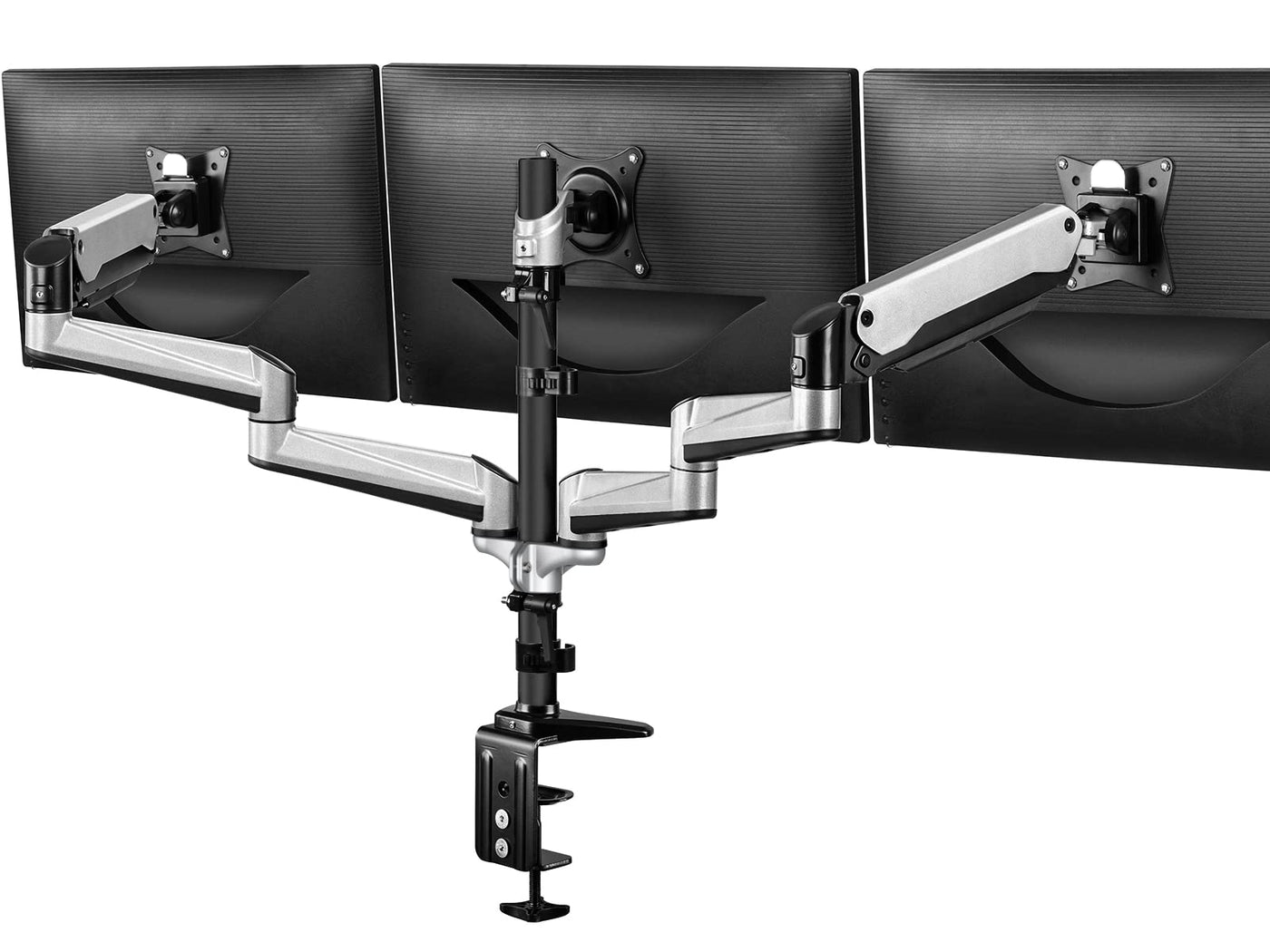 Universal 3 Monitor Stand - Fits Three Flat / Curved Computer Monitors 17 18 19 20 21 22 23 24 25 26 27 28 29 30 31 32 Inch In Size With Vesa Mounting Holes 75X75 And 100X100, Each Arm Hold 17.6Lbs. Kindly Note: Ultrawide Screen Is Not Supported! | Super Space Saver - Conveniently Frees Up More Valuable Work Space By Elevating 3 Monitors Off Of Your Desk, Making Your Workstation Spacious And Clutter-Free. | Customized For Optimal View - The Fully Articulating Arms Allow Your Monitors Swivel, Tilt And Rotate To Find An Optimal View Angle And Position For Comfortable Work. Freely Set Your Monitors To Landscape Or Portrait Mode! | Increase Comfort & Efficiency - Complete Your Work In 3 Monitors At The Same Times With Comfortable View Position. Now You Can Enhance Your Work Efficiency In Comfortable Work Posture. | 2 Mounting Options -The C Clamp And Grommet Mounting Base Holds Your Monitors Securely. Choose The Proper Mounting Method As Your Need.