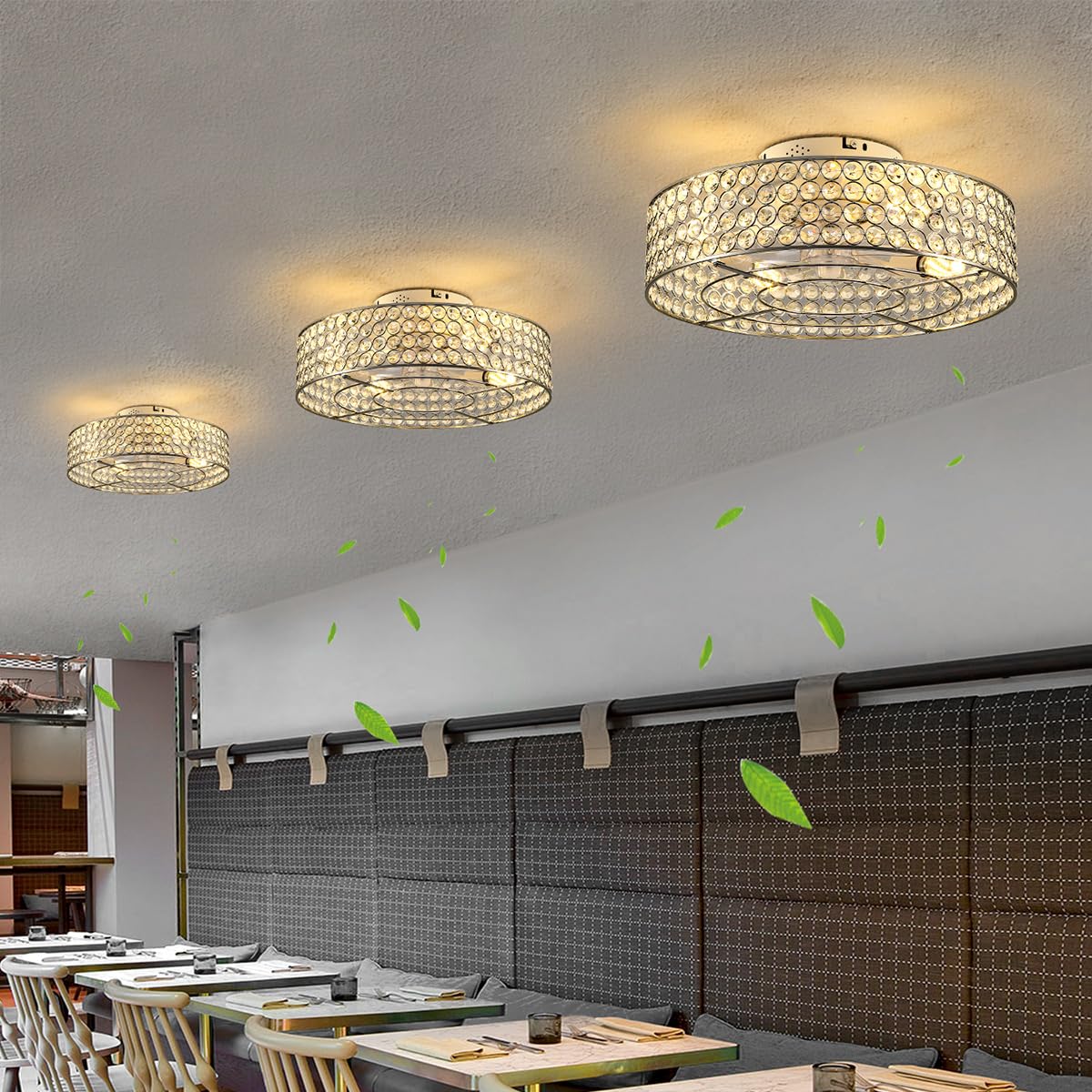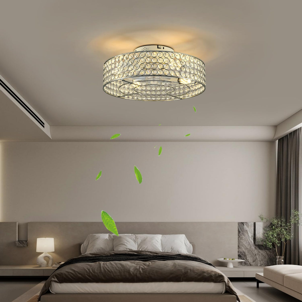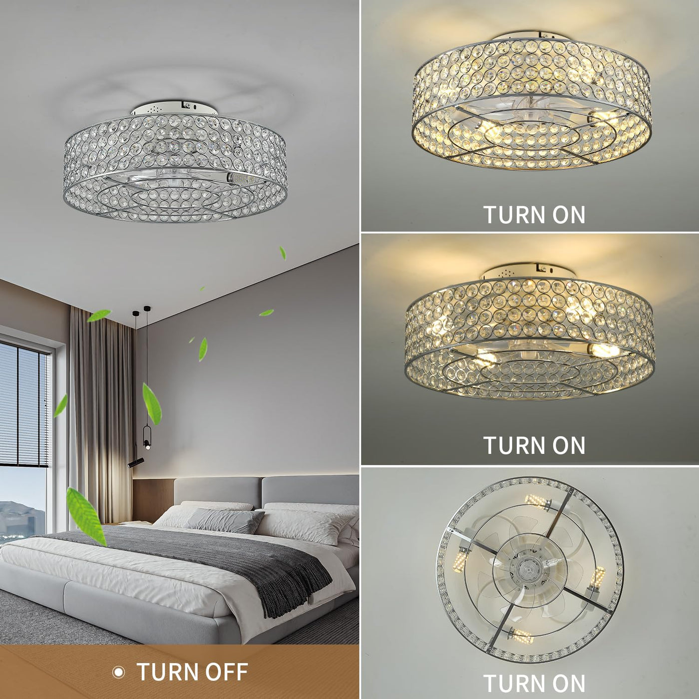 Hueoczw Modern Low Profile Ceiling Fans With Lights And Remote, 20 Inch Crystal Bladeless Flush Mount Caged Ceiling Fan For Bedr