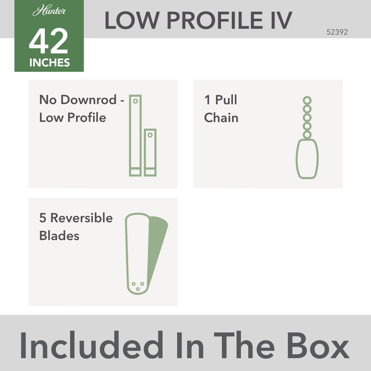 The Hunter Low Profile Iv Traditional Ceiling Fan Is Designed With Housing Specially Crafted To Fit Flush To The Ceiling Making It Ideal For Use In Your Small Rooms With Low Ceilings. Available In Multiple Finishes, This Low-Profile Ceiling Fan Without Light Is Powered By A Three-Speed Whisperwind Motor To Deliver Ultra-Powerful And Whisper-Quiet Performance Making It The Perfect Complement For Your Casual Living Rooms And Bedrooms.