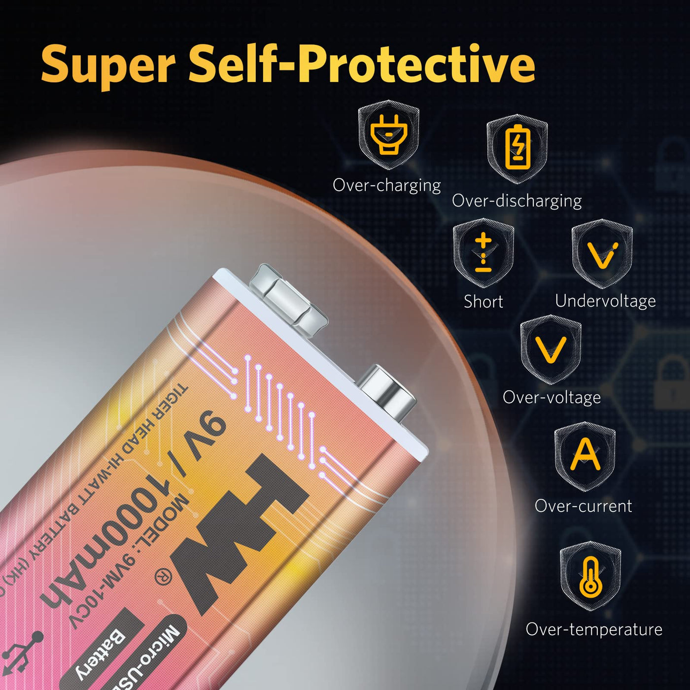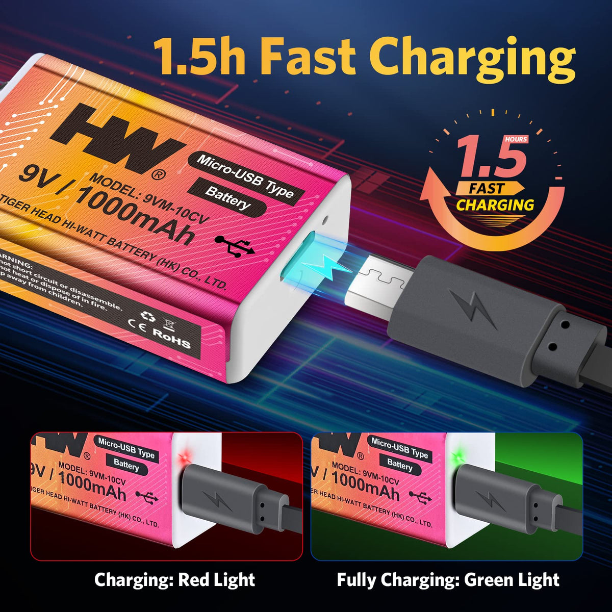 Hw 9V Li-Ion Rechargeable Battery, 9 Volt/1000Mah(9000Mwh) Long Lasting Rechargeable Batteries With Micro-Usb, 1000 Cycles Charg