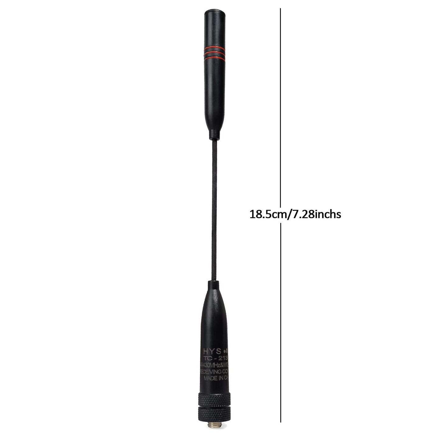 Q: What is the gain of this antenna and why is it important?A: The HYS antenna offers a gain of 1.8dBi for VHF and 2.5dBi for UHF, which enhances signal transmission and reception, allowing for clearer communication over longer distances.