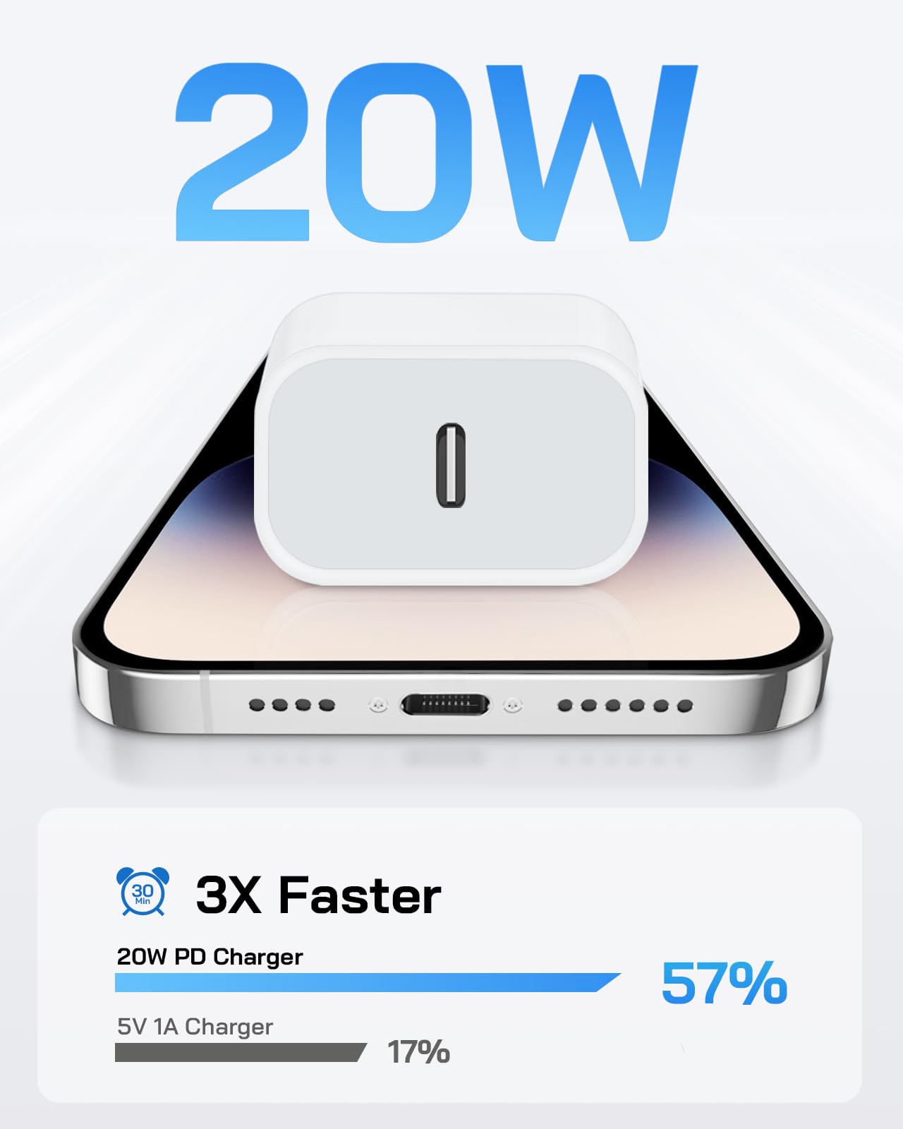 Q: How fast can the AISNI 20W charger charge my device?A: The AISNI 20W USB C Fast Charger can charge your device up to 3 times faster than the standard 5W charger, thanks to its maximum output of 20W power.
