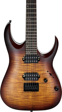Rga Series Rga42Fm Electric Guitar Flat Dragon Eye Burst. If Ibanez Can Lay Claim To The Title Of Being The Strongest Name In Metal Guitars, Then The Rga Is The Model This Reputation Was Built On. Every Inch Of This Classic Screams Speed, Fury, And Expression. The Rga42Fm Is A Hardtail 6-String Electric Built Around A Mahogany Body With Stunning Flamed Maple Top. Its Contoured Top Not Only Looks Sleek-It Creates A Softer, More Comfortable Edge Where The Players Right Forearm Rests. Other Features Include A Fast, Thin, Wizard Iii Maple Neck And Rosewood Fretboard With Jumbo Frets For Maximum Left Hand Performance. This Neck And Fretboard Combination Provides A Smooth, Inviting Playing Surface And Contributes To The Rga42Fms Warm, Well-Defined Tonality. Proprietary Quantum Pickups Offer An Entire Palette Of Thick, Distorted Tone Textures That Never Sacrifice High-End Articulation. A Simple, Yet Solid Fixed Bridge Provides Stable, Dependable Tuning And Accurate Intonation. Case Sold Separately.