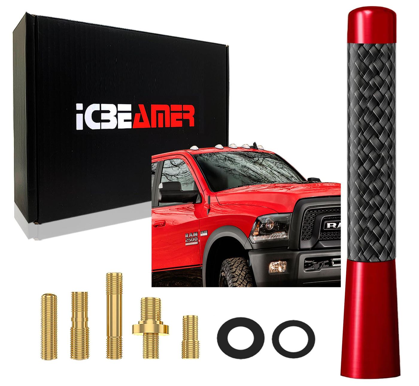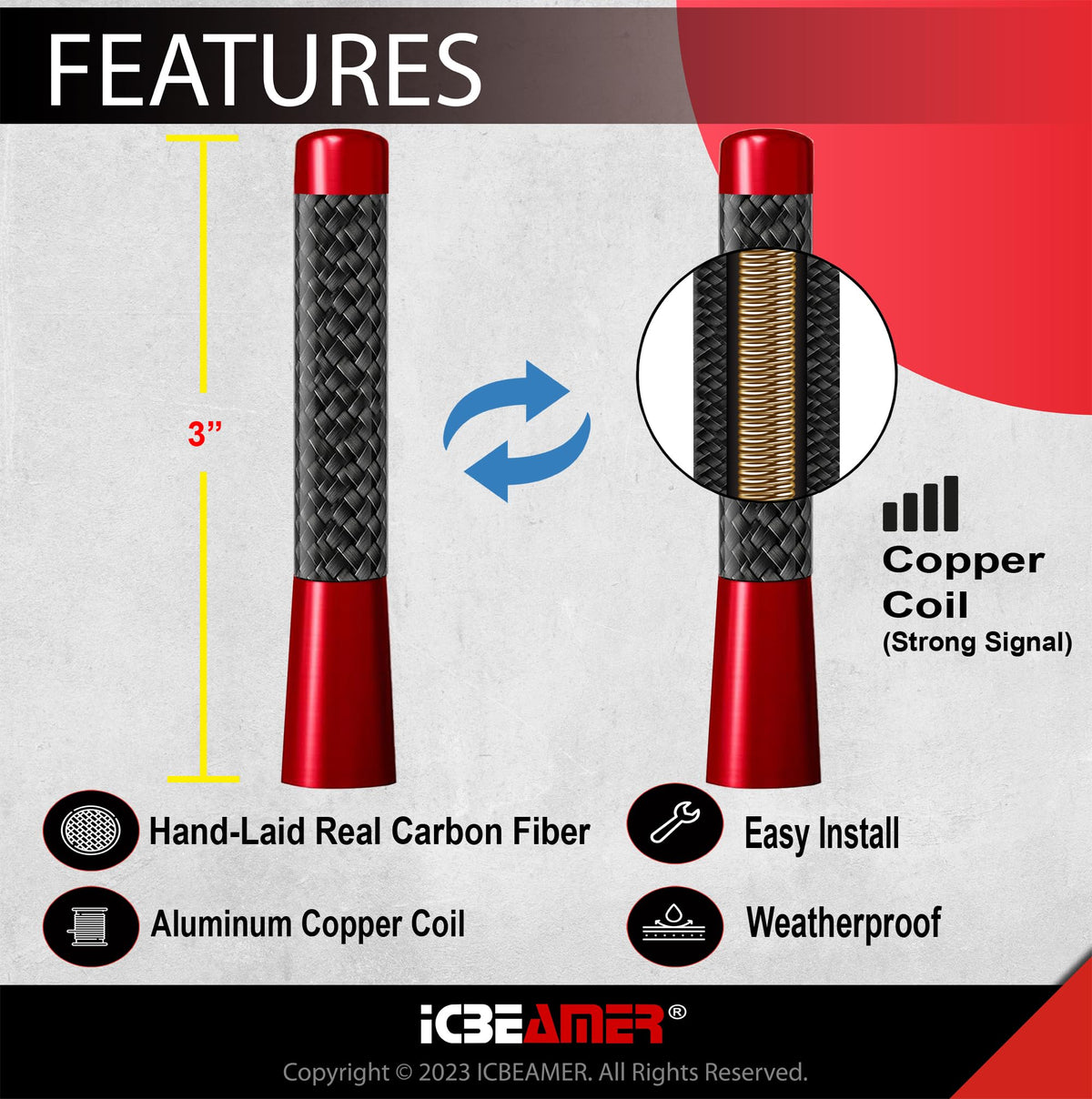 Icbeamer 3'' 76 Mm Carbon Fiber Polished Finish & Red Aluminum Short Automotive Antenna With Internal Copper Coil Universal Fit Am/Fm Radio Antenna Replacement Compatible For Car, Truck And Van