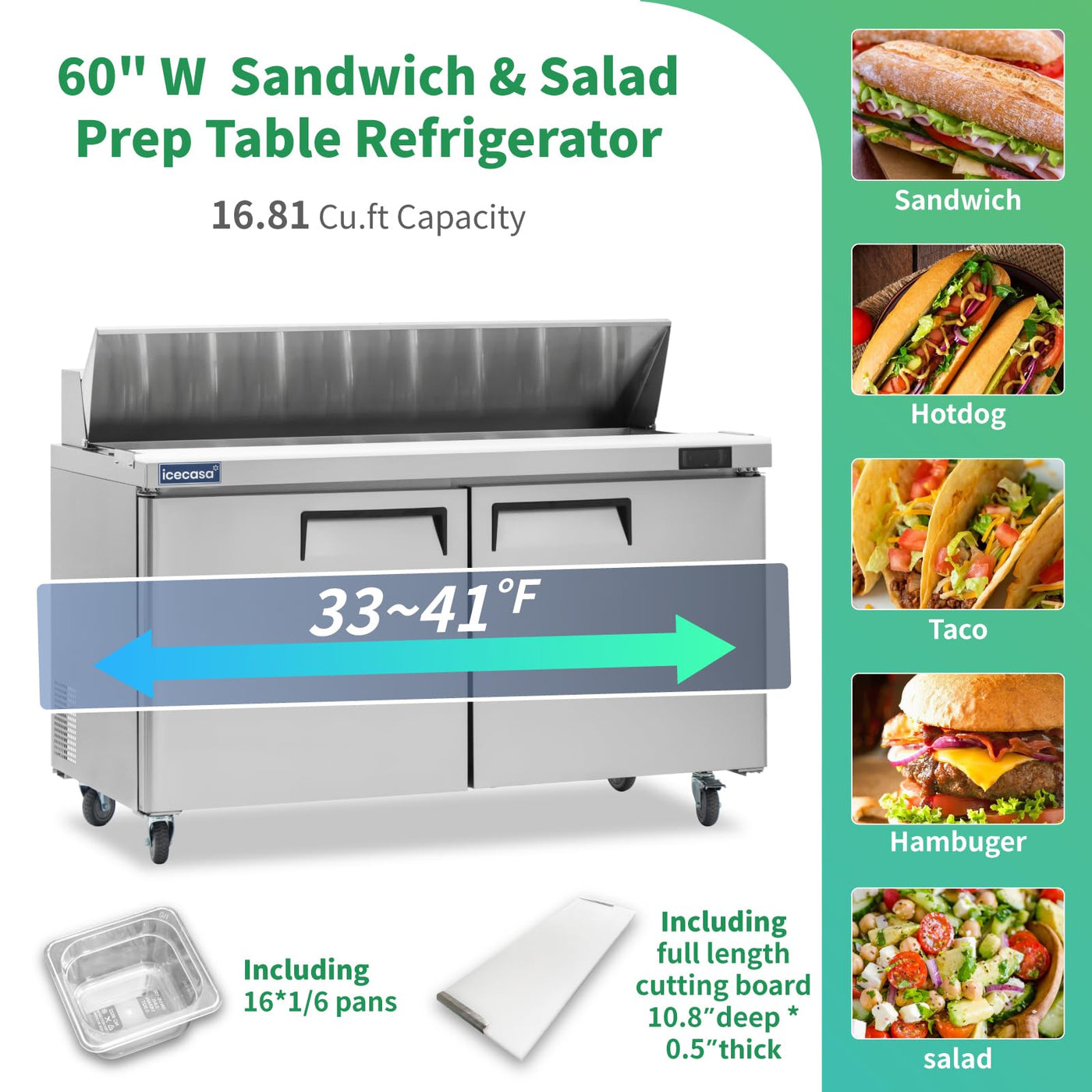 Icecasa 60'' W Commercial Refrigerator Sandwich&Salad Prep Table Single Door Stainless Steel Counter Fan Cooling Refrigerator Wi