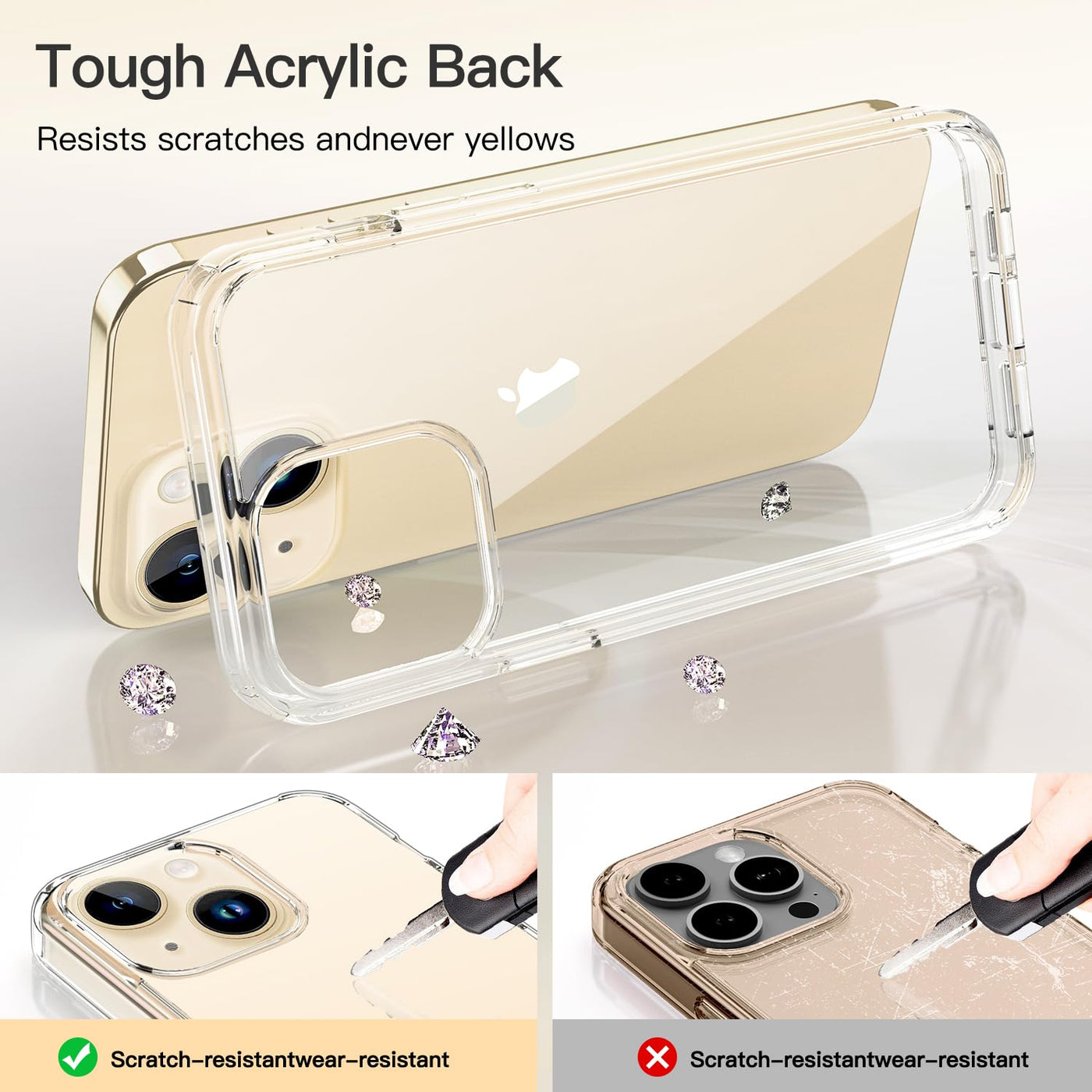 Q: What materials are used in the ICEDIO iPhone 14 Plus Clear Case?A: The ICEDIO iPhone 14 Plus Clear Case is made with a hard acrylic back and a soft, non-slip TPU rubber bumper. This combination provides both durability and a comfortable grip.
