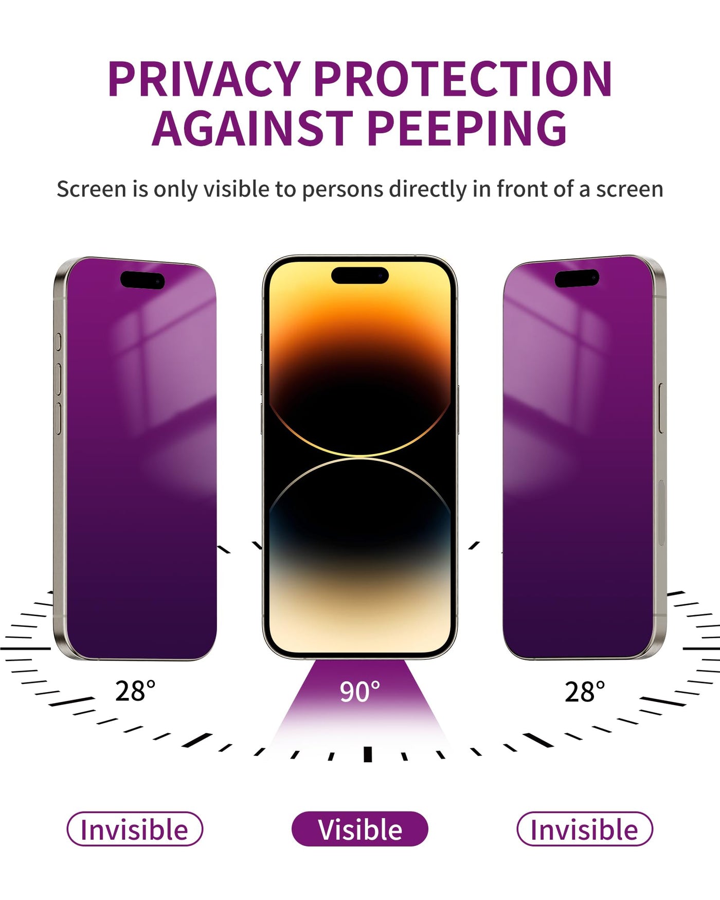 Privacy Screen Protector For Iphone 14 Pro 5G 6.1'' Features: 2 Pack: Includes 2 Privacy Screen Protectors. Gradient Light: The Screen Protector Displays A Glitter Purple Gradient When Viewed From Different Angles Under Light. Anti Bluelight: Utilizes Blue Light Filtering Technology To Remove Blue Light Emitted From Your Phone Screen. It Effectively Filters Out 95% Of Blue Light While Allowing Non-Harmful Light Through, Helping Prevent Sleep Disorders And Eye Strain. Anti Peep: Protects Your Private And Sensitive Information From Strangers In Public Places Such As Buses, Elevators, And Metros. The Screen Is Only Visible To Individuals Directly In Front Of It. Impact & Scratch Protection: Made With High-Quality Tempered Glass That Has A Hardness Rating Of 9H, Providing Scratch Resistance And Helping To Prevent Your Iphone 14 Pro Screen From Breaking. Shatterproof Design: Designed To Resist Shattering Or Splintering. In The Event Of Screen Damage, The Pieces Will Stick Together For Safety. Sensitive Touch: This Tempered Glass Provides Privacy Protection While Ensuring Quick App Operation And Sensitive Gameplay. Full Coverage & Case Friendly: The Screen Protector Covers Almost The Entire Screen Of The Iphone 14Pro, Leaving A Slight Space On The Edges For Easy Phone Case Entry Without Lifting Up The Protector. Package Accessories: 2 X Iphone 14 Pro Screen Protector 2 X Wet And Dry Wipes 2 X Dust Removal Stickers