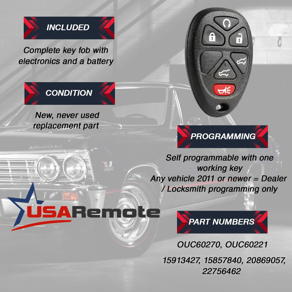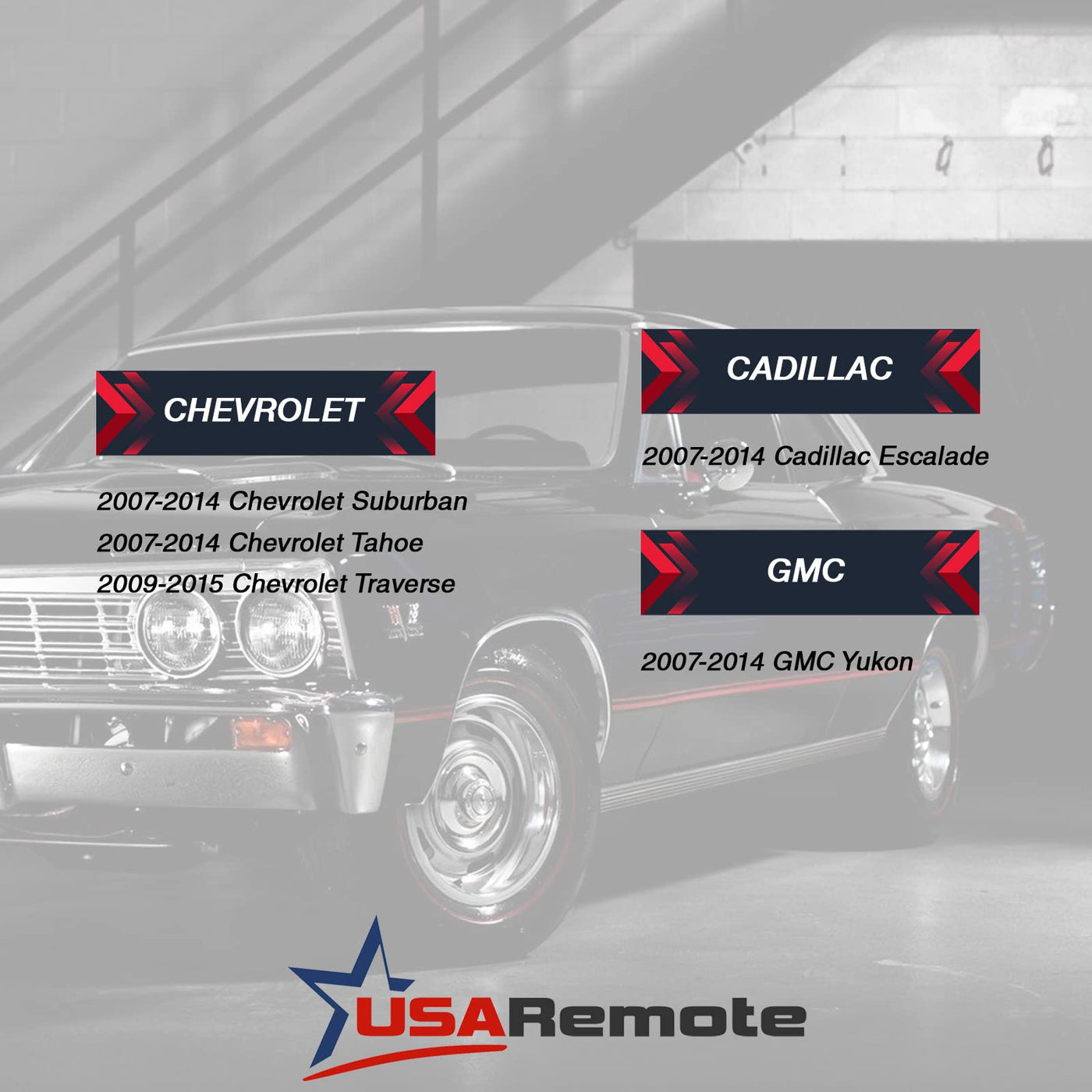Replace Your Lost Or Broken Keyless Entry Key Fob Remote With A Usaremote Fob. Fits P/N: Ouc60270, Ouc60221Cadillac:2007-2014 Escalade (Includes Esv And Ext)Chevrolet:2007-2014 Suburban (Includes 1500 And 2500)2007-2014 Tahoe2009-2017 Traversegmc:2007-2014 Yukon (Includes 1500 And 2500)This Is A Replacement Aftermarket Part.