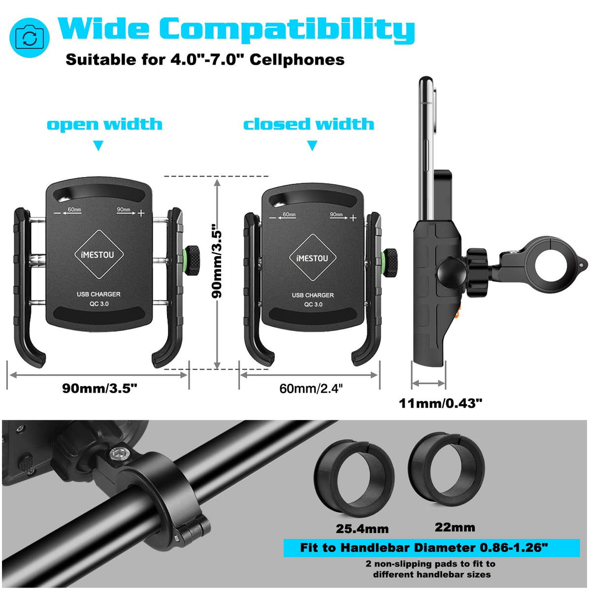 Imestou Waterproof Motorcycle Phone Holder Usb Quick Charge 3.0 Socket Handlebar Phone Mount Charger Compatible With Samsung Iphone Cellphonesspecification : Dimension: 3.5 X 2.7 X 1 Inches Weight: 7.6 Ounces Material: Auto Grade Abs Input: Dc 12/24V Output: Dc 5V 3.6A; 9V 2A;12V 1.5Apackage Included: 1 X Phone Mount With Qc 3.0 Usb Charger 2 X Plastic Pads 1 X 10A Fuse 1 X Rear View Mirror Extender Bar 1 X #4 Allen Wrench Cautions: Check Max. Voltage On Devices Before Using. Always Cover Outlets When Not In Use To Avoid Dust And Water. This Product Is For 12/24V Vehicles Only. Only Use On Specified Voltage. Make Sure Your Phone Or Navigation Is Securely Tightened Before Driving. Do Not Operate This Device While Driving.