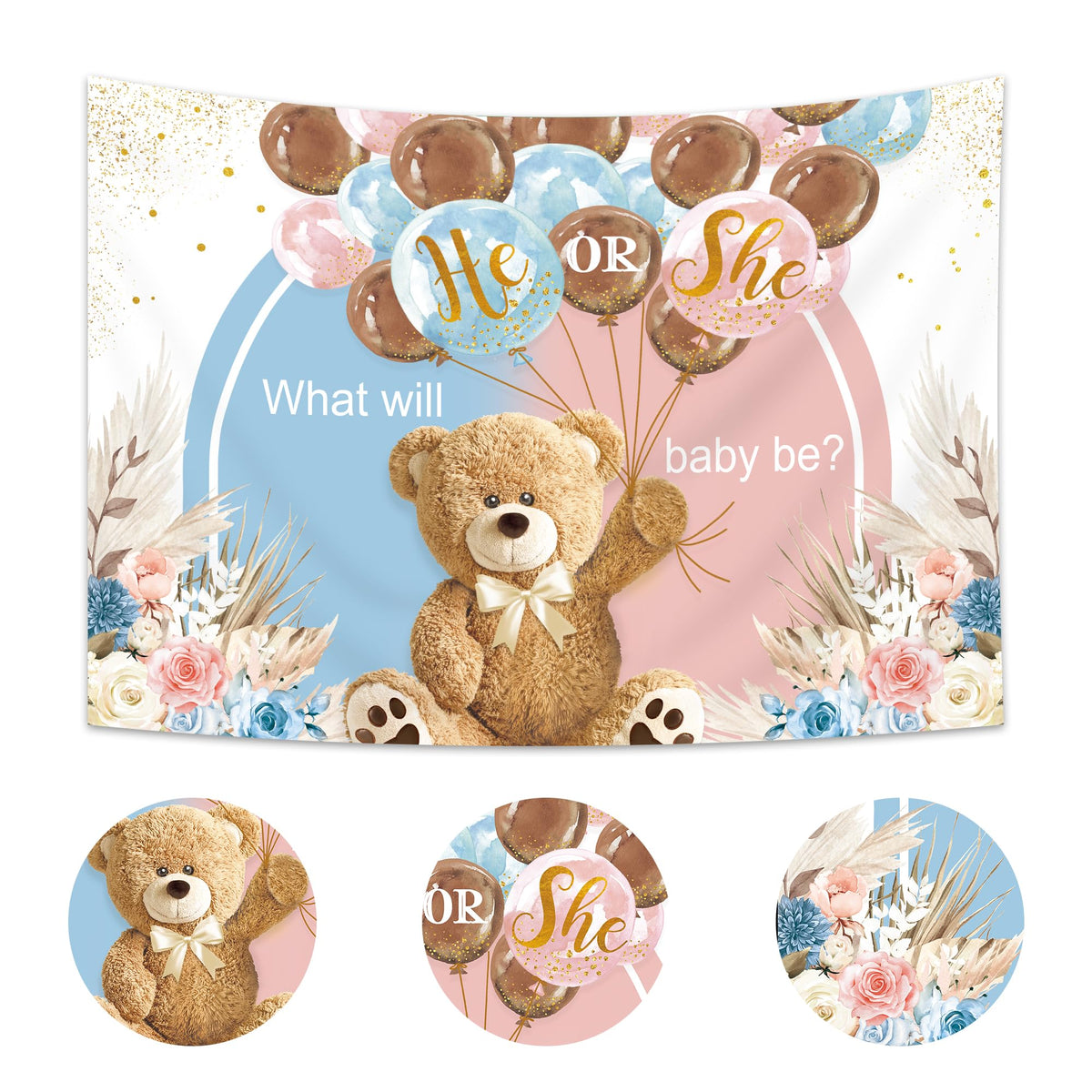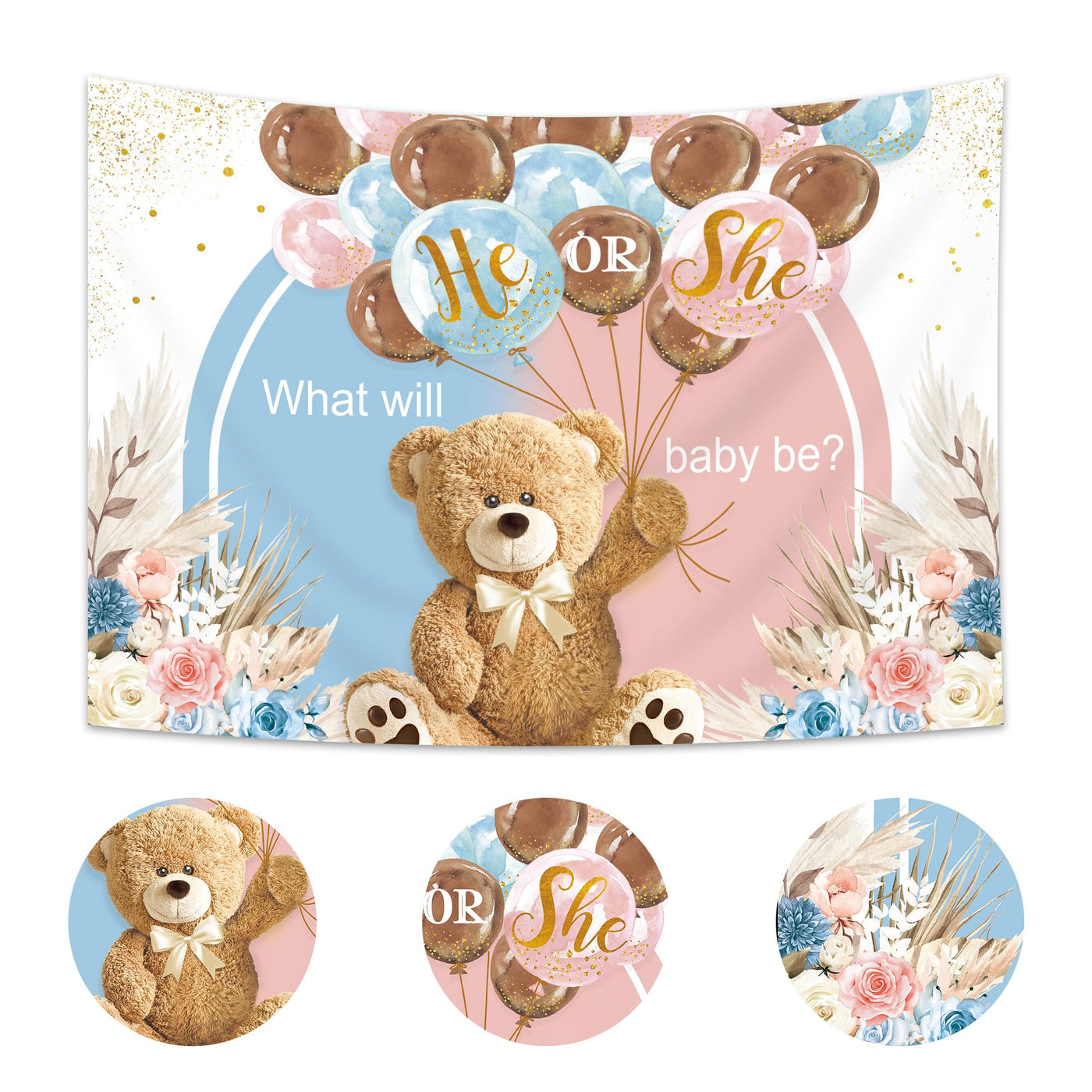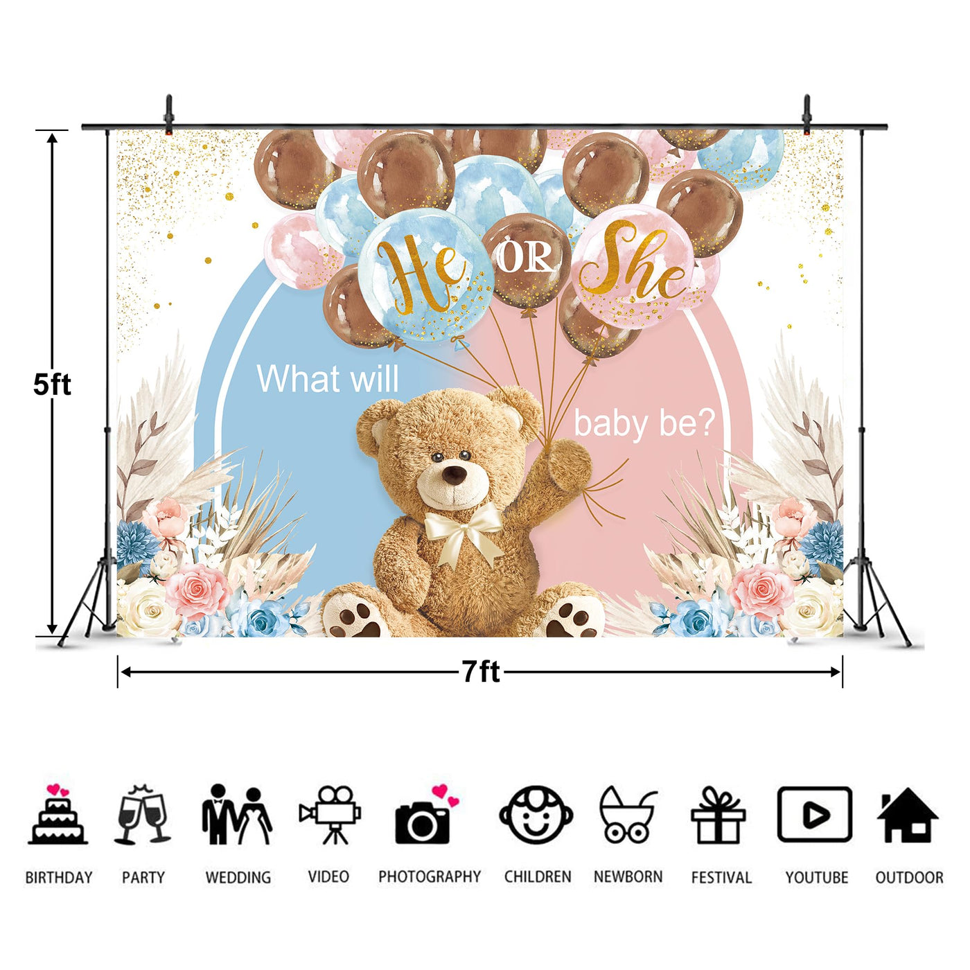 Imirell Bear Gender Reveal Backdrop 7Wx5H Feet Pink Blue He Or She What Will Baby Be Boho Flower Pampas Balloon Polyester Fabric