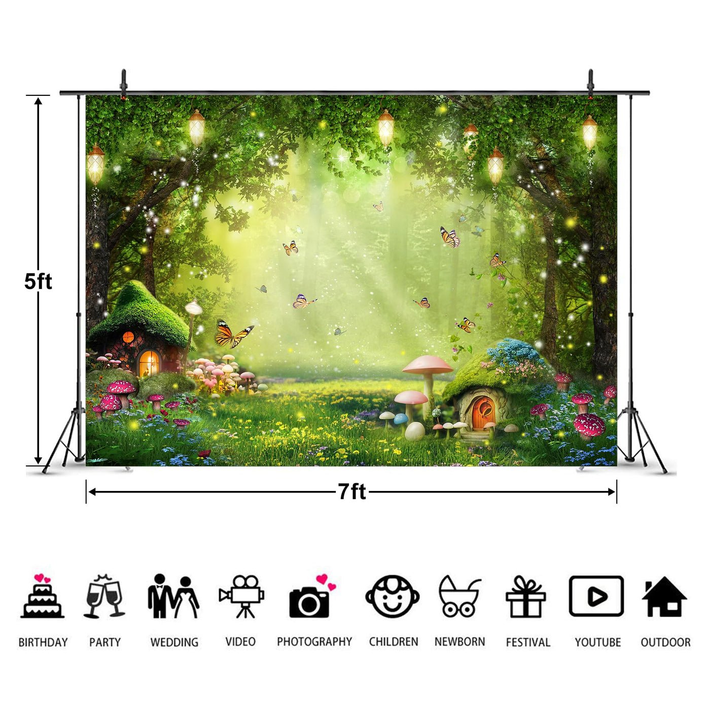 Imirell Enchanted Backdrop 7Wx5H Feet Fairy Tale Wonderland Mushroom Greenery Woodland Butterfly Flower Polyester Fabric Spring